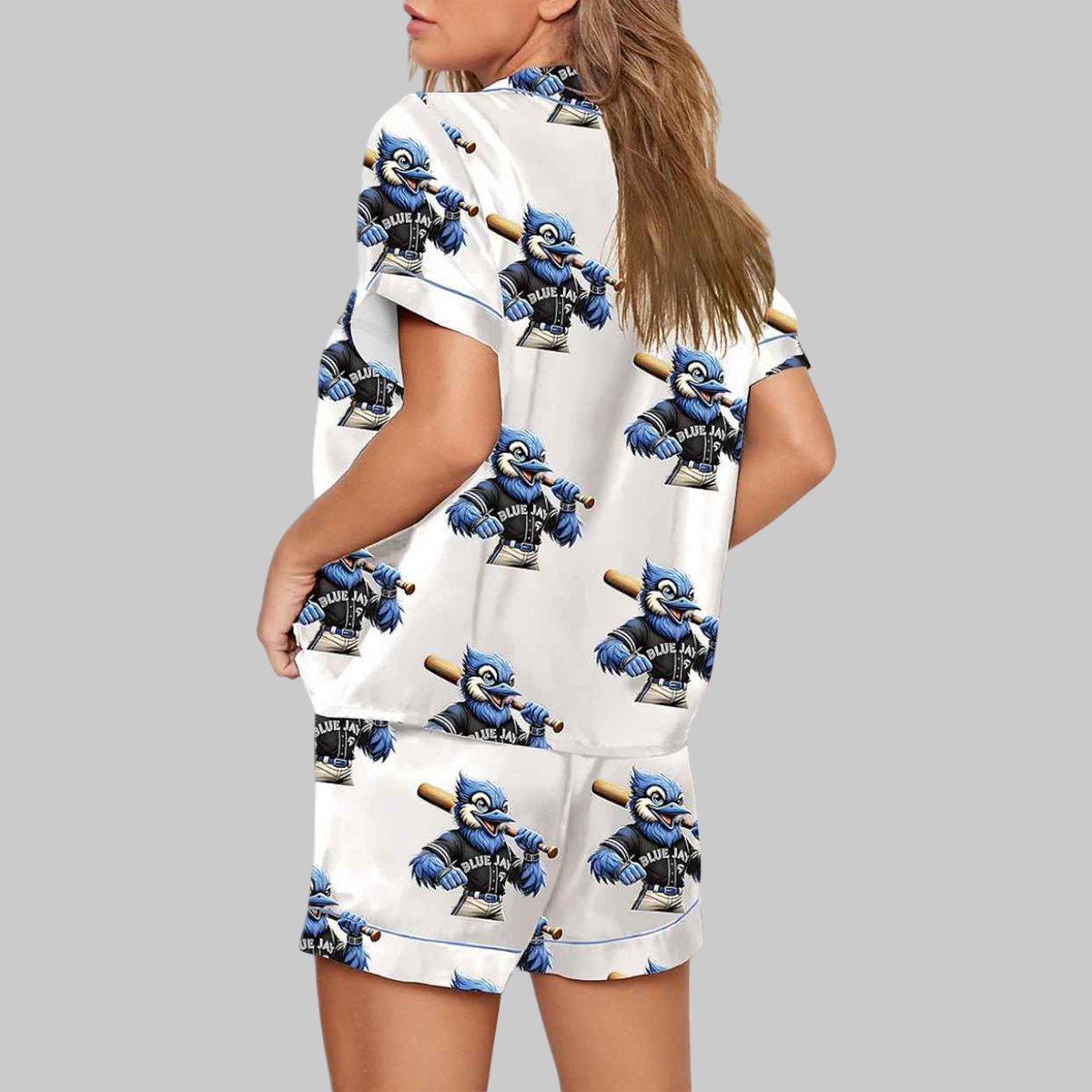 This pajama set features an all-over print of a dynamic blue jay gripping a baseball bat, wearing a confident grin and the team’s colors with pride. The details pop beautifully against the clean white satin background, highlighted by light-blue piping along the edges. Every element reflects the high energy and passion of the Blue Jays’ championship spirit. Whether you’re lounging on the couch or hosting a post-game movie night, this design lets your Toronto fandom shine through in a fresh, modern way.