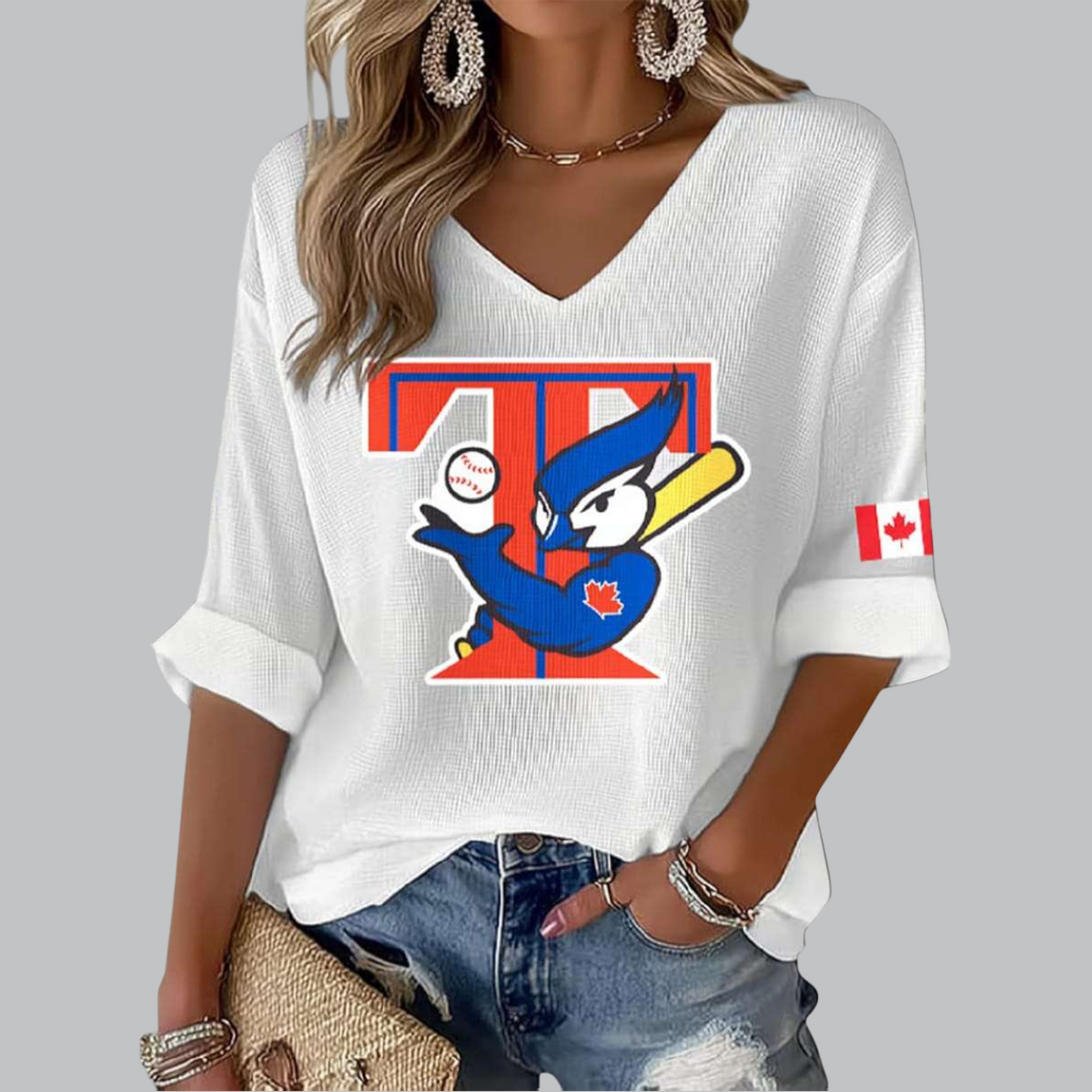 This waffle-knit long sleeve tee features a relaxed fit with a flattering V-neck cut that adds a touch of elegance to classic sportswear. The front showcases a powerful blue jay mascot swinging a bat in front of a bold red “T,” representing Toronto’s fierce energy and Canadian pride. On the sleeve, a small embroidered maple leaf flag completes the look: subtle, yet unmistakably patriotic.