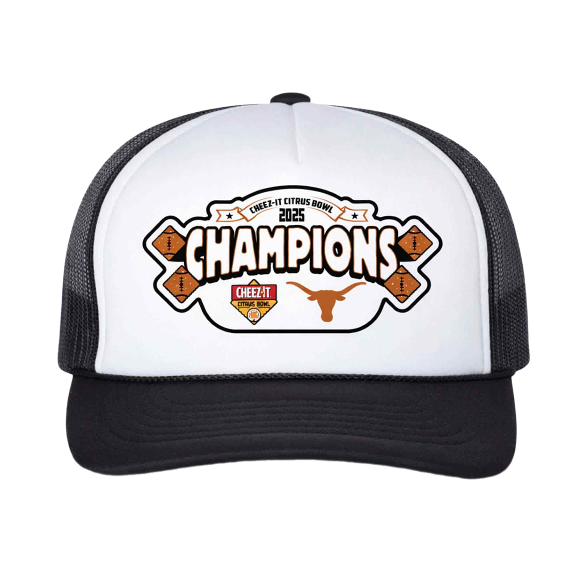 Visually, the design is sharp and instantly recognizable. The front panel features a bold “CHAMPIONS” graphic centered within a custom badge layout, flanked by football-inspired icons and the clearly marked “2025” detail above. The Cheez-It Citrus Bowl emblem sits neatly within the design, while the Texas longhorn symbol anchors the look with unmistakable identity. The white front panel creates strong contrast against the black curved brim and black mesh back, giving the hat a clean, modern trucker silhouette that feels both sporty and casual.
