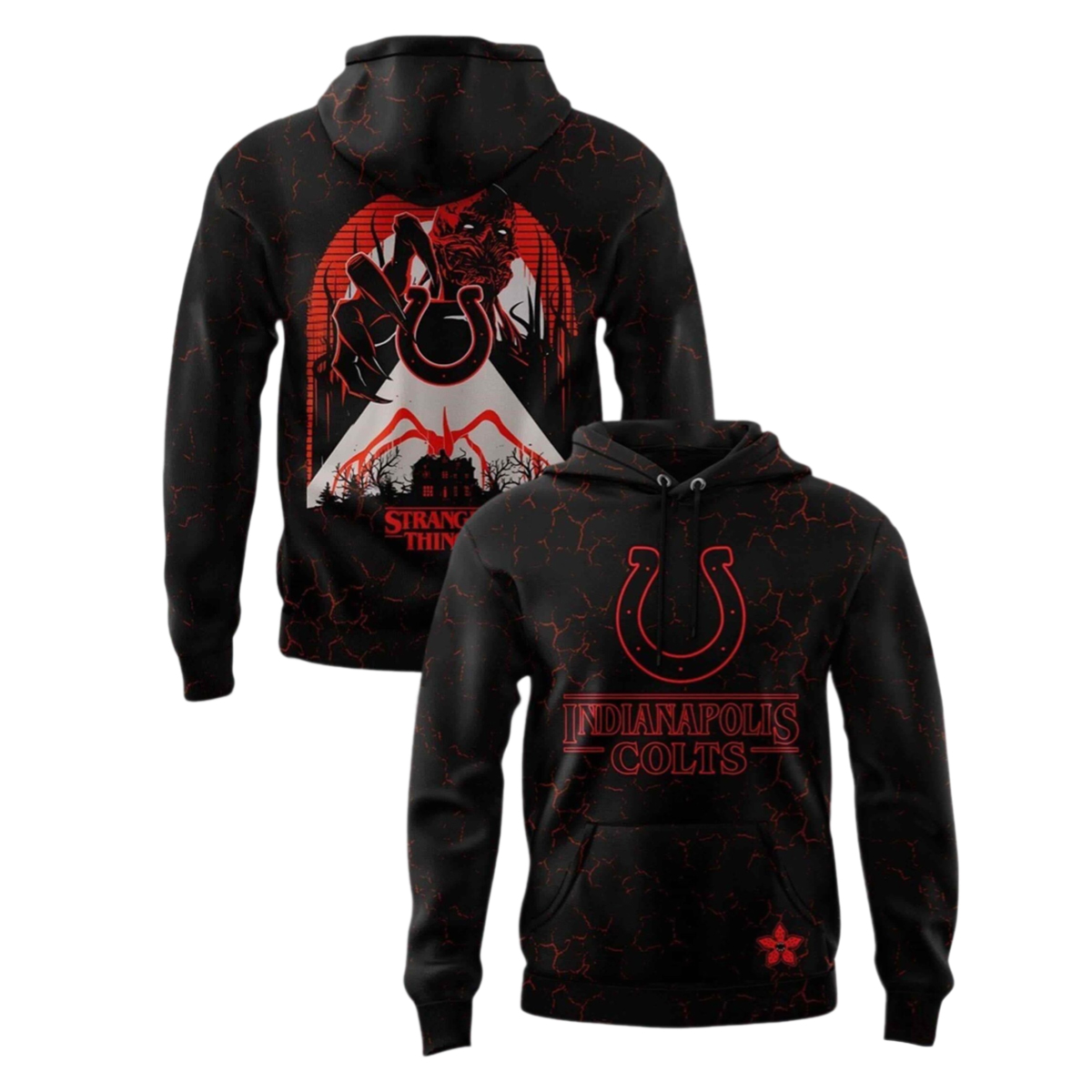 The 2025 Colts x Stranger Things 5 Hoodie blends eerie Upside Down energy with the proud spirit of Indianapolis, creating a crossover design that feels bold, cinematic, and instantly collectible. With its cracked-black background, glowing red artwork, and dramatic silhouette details, this hoodie is built for fans who love standout pieces.