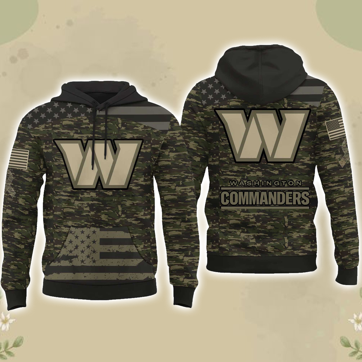 The hoodie features a full camouflage pattern constructed from deep green and charcoal hues, creating a rugged, tactical-inspired look. Centered on the front is the bold Commanders “W” emblem in a muted stone shade, framed with sharp black outlines for maximum visibility against the camo background. The kangaroo pocket incorporates a grayscale American flag graphic, adding a patriotic accent that ties seamlessly into the overall theme. Both sleeves showcase subtle flag patches, reinforcing the tribute-inspired design without overwhelming the aesthetic.