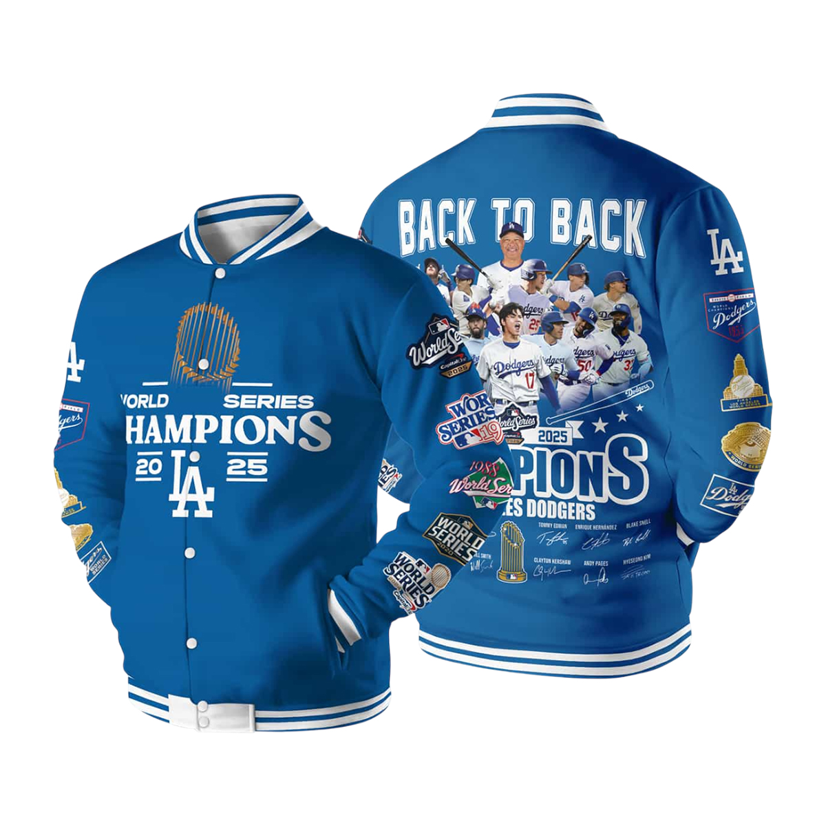 The 2025 Dodgers World Series Champions Baseball Jacket is more than just apparel it’s a statement of loyalty, pride, and a deep connection to one of the most iconic teams in baseball history. Designed for true fans, this bold and commemorative jacket honors the Dodgers’ incredible 2025 championship win with standout graphics, detailed embroidery, and a dynamic display of team spirit. Featuring powerful “Back to Back” lettering, celebratory imagery of the players, and championship highlights, every inch of the jacket tells a story of hard work, unity, and victory. With visually striking artwork including the 2025 trophy, players’ signatures, and past World Series nods, this piece is a wearable celebration of Dodgers glory.