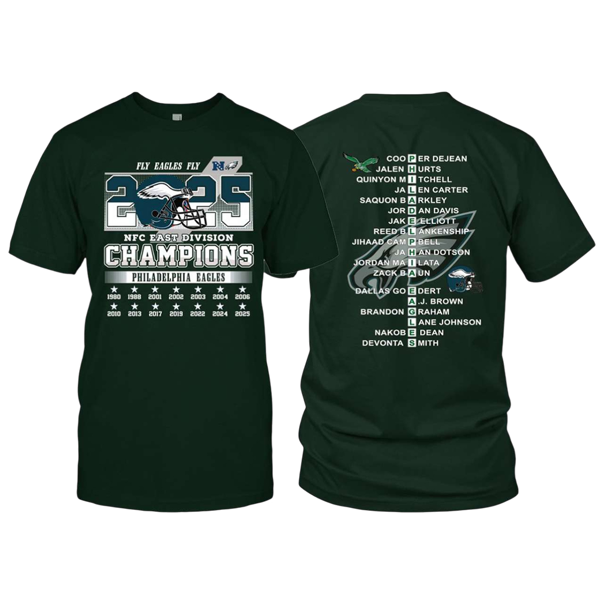 At first glance, the front of the 2025 Eagles NFC East Champs Two Sided Shirt commands attention with a powerful championship layout centered around “2025 NFC East Division Champions.” The typography is bold and layered, anchored by a strong team color that instantly connects with long-time supporters. Beneath the main headline, a timeline of division title years is displayed, turning the shirt into a visual archive of dominance rather than a single-moment celebration.
