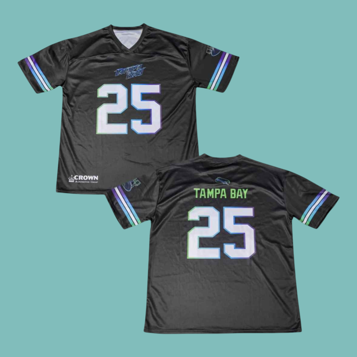 The 2025 Rays Football Jersey Giveaway comes in a sleek black football-jersey silhouette with a V-neck, a large 25 on the front and back, “TAMPA BAY” across the upper back, and sharp sleeve striping in teal, purple, and light blue that adds a bright, modern pop.