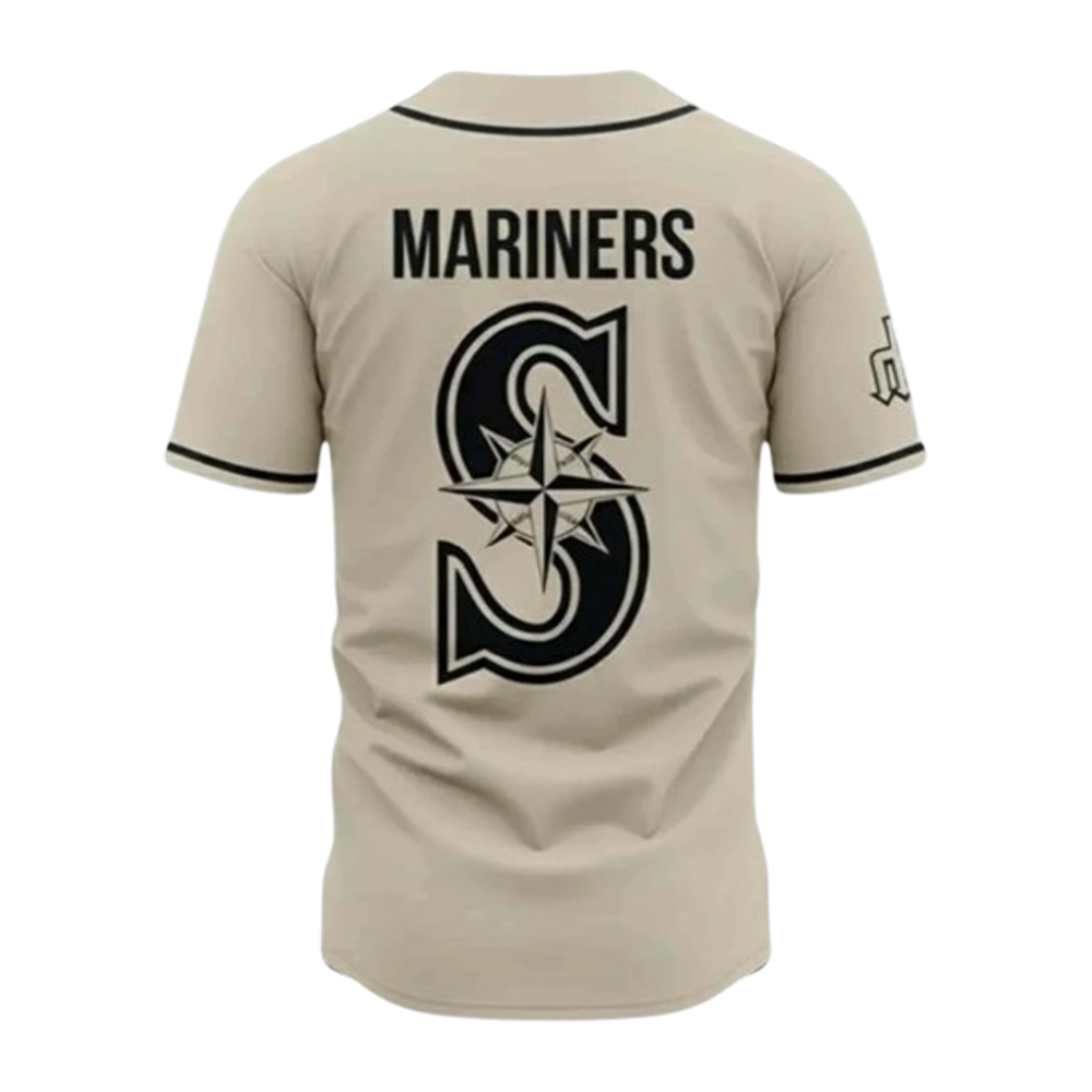 This button down baseball jersey is crafted from a smooth, breathable fabric in a light tan color, evoking the comforting look of a Pho broth. The front is a vibrant graphic featuring the words “PHO KIT” above a detailed illustration of a steaming bowl of Pho and all its fresh garnishes. The back maintains classic team pride with “MARINERS” across the shoulders and the iconic black compass “S” logo. Designed as a unisex garment, it offers a relaxed fit for all fans.