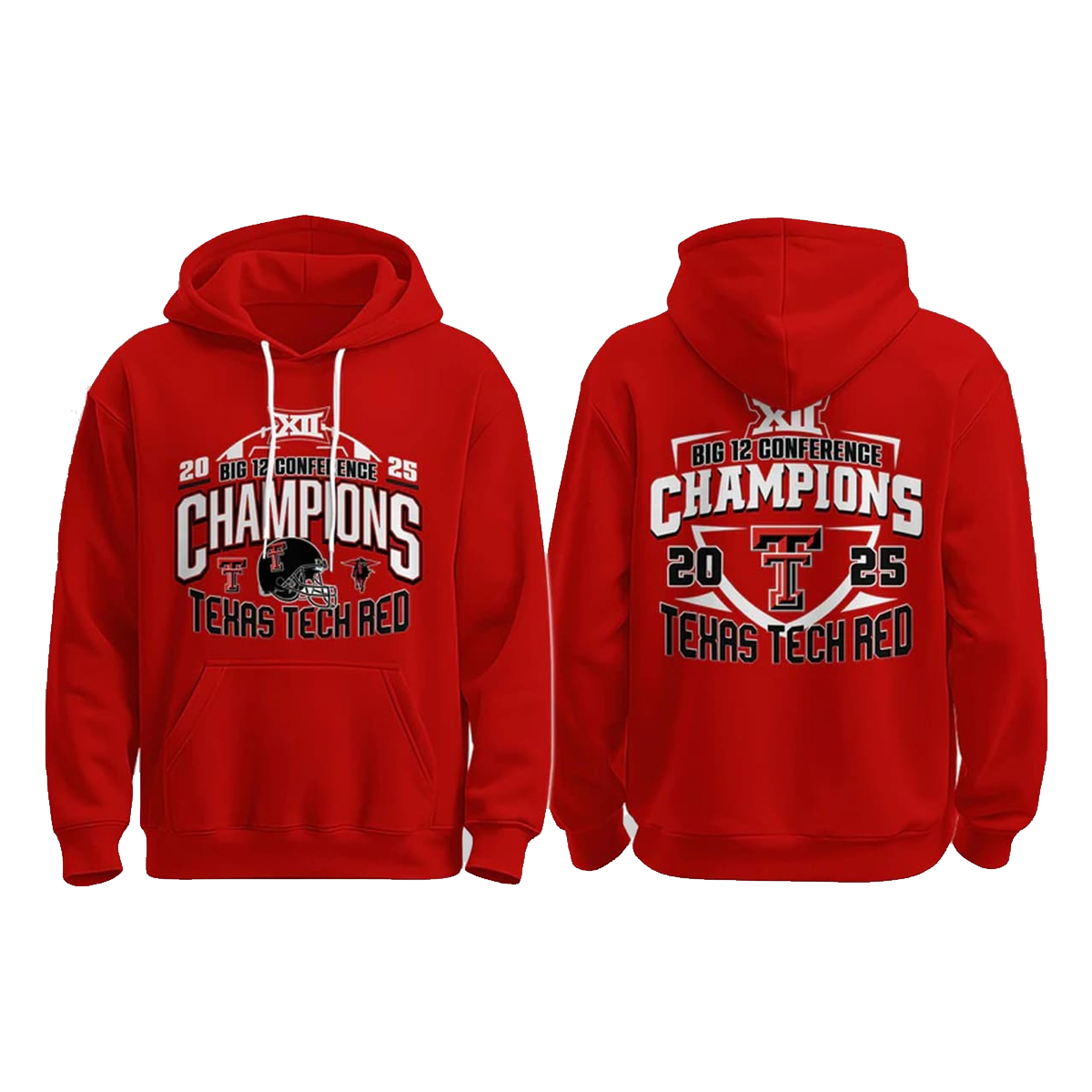 This hoodie stands out with its bold red color and championship graphics printed clearly on both the front and back. The front design showcases a strong “Champions” banner positioned over a football graphic, framed by the year “2025” and the words “Big 12 Conference.” Below, the Texas Tech helmet and Red Raiders logo add depth and authenticity to the design. On the back, the artwork transforms into a large championship crest featuring “Big 12 Conference Champions,” the double-T emblem, and the 2025 year markers arranged around a shield-like frame. The clean layout and striking typography make the hoodie visually powerful and deeply connected to the celebratory atmosphere of the championship win.