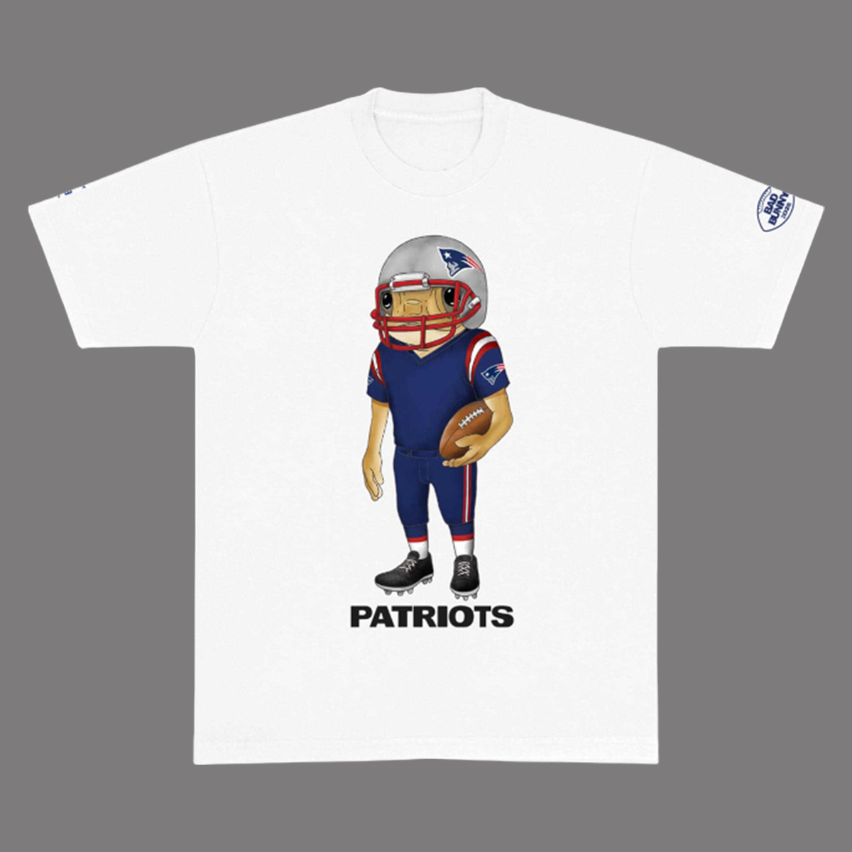 Featuring a cartoon-style football player decked out in the classic red, white, and blue Patriots uniform, this shirt adds a playful twist to your collection. The front design showcases the character holding a football with confidence, standing above the bold “PATRIOTS” lettering. On the back, the signature patriot head logo stretches wide across the shoulders, instantly recognizable and full of attitude. With subtle influences inspired by Bad Bunny’s distinct style and flair, the design is both nostalgic and modern, making it perfect for fans who want something different from the usual sports gear.