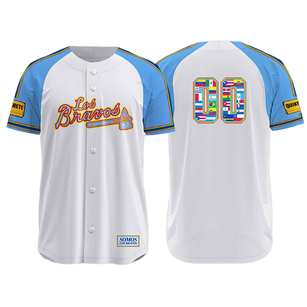 The 2026 Braves Los Bravos Giveaway Jersey features a sleek white body with light blue sleeves, combining a fresh, modern look with traditional team colors. “Los Bravos” is prominently displayed across the chest in bold, bright lettering, celebrating the team’s identity in the Latinx community. The back of the jersey features the number “00,” a striking visual representation made up of colorful flags from around the world, symbolizing diversity and unity. The jersey also includes “SOMOS LOS BRAVOS” on the front, reinforcing the connection to the Latinx culture. On the sleeves, you’ll find logos that further celebrate this unique collaboration, making it a true collector’s item for fans of all backgrounds. Whether you’re wearing it to the game or showing your team spirit in the community, this jersey is a great way to honor the team and the culture it represents.