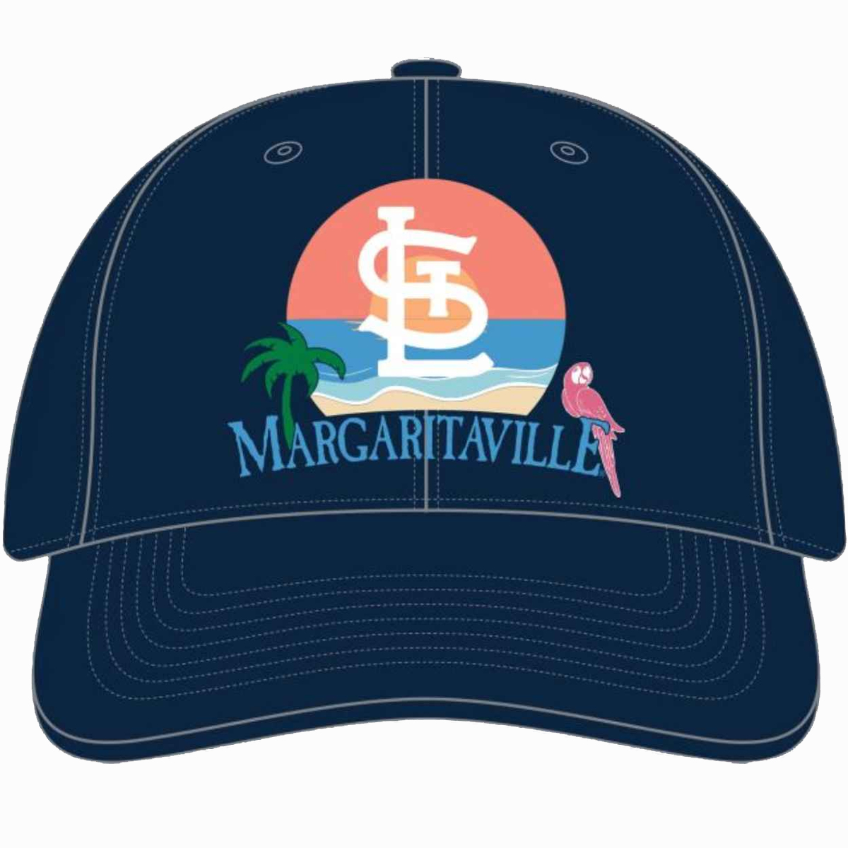 The 2026 Cardinals Margaritaville Night Cap Giveaway stands out with a deep navy base that feels clean, modern, and easy to pair with almost anything. At the center front, a colorful sunset-style circle graphic sets the tone: warm coral and soft blue bands create a coastal horizon backdrop, topped with a crisp white interlocking “STL” mark for a sharp, high-contrast finish.