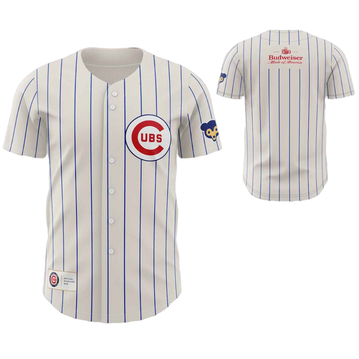 The 2026 Cubs BudFridays Cubs 1960s Jersey Giveaway channels a timeless 1960s aesthetic through a clean cream base and crisp blue pinstripes that instantly feel ballpark-ready. The front keeps it traditional with a button-up design and a rounded hem that sits comfortably whether you wear it tucked, untucked, or layered. A standout Cubs “C” crest on the chest brings strong team identity with bright, high-contrast color that pops against the neutral background. The sleeves add extra character with a playful bear-head patch detail that gives the jersey a unique, event-style finish. On the back, a Budweiser-themed mark near the upper shoulders completes the BudFridays concept and reinforces the retro celebration vibe. Altogether, the design balances heritage and modern wearability—clean lines, bold logos, and a pinstripe pattern that looks sharp from every angle.
