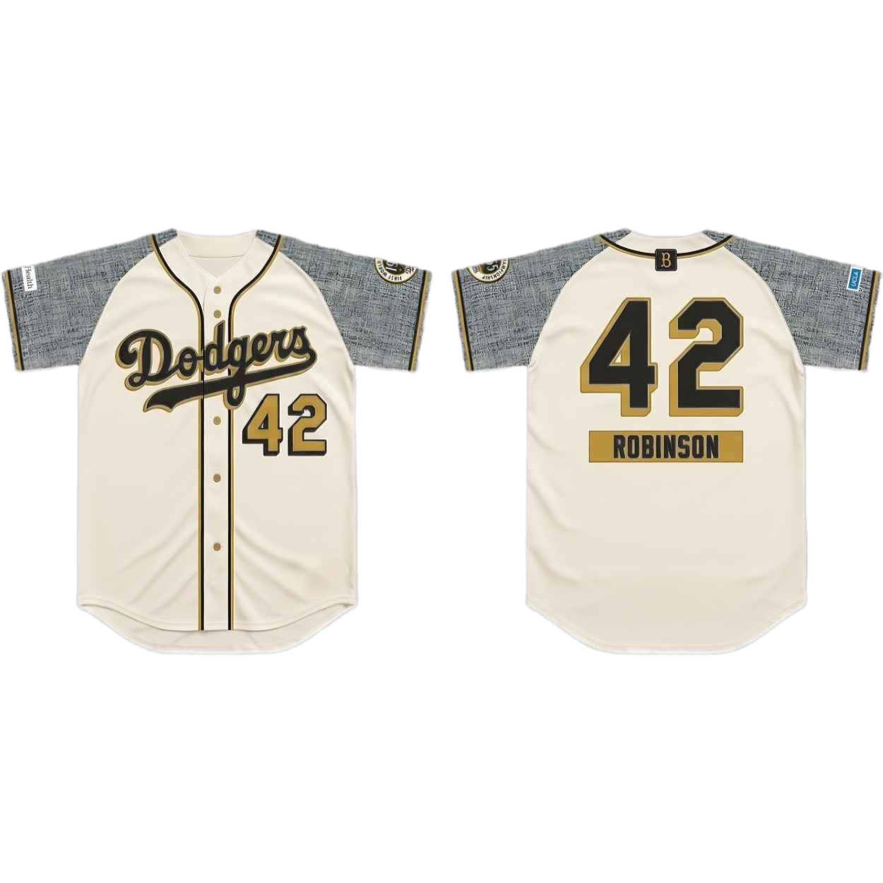 The 2026 Dodgers Jackie Robinson Jersey Giveaway features a refined cream-toned base that immediately sets a classic, heritage-inspired tone. Across the front, the flowing “Dodgers” script appears in dark lettering with gold-accented outlines, paired with the iconic number “42” placed prominently on the lower chest. The sleeves introduce a contrasting textured gray fabric, adding depth and a modern touch while still feeling understated and respectful. Black-and-gold piping runs along the button placket, collar, and sleeve edges, tying the entire design together with a dignified finish. On the back, “ROBINSON” appears above the large number “42,” making the tribute unmistakable and powerful at first glance. The traditional button-front silhouette keeps the jersey timeless and wearable.