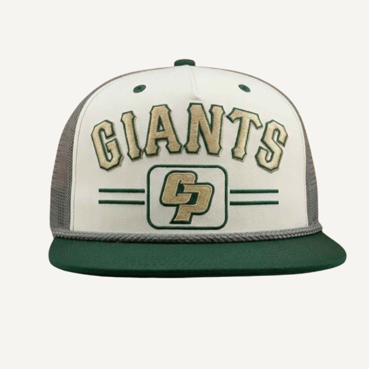 The 2026 Giants Cal Poly Night Roped Hat features a crisp white structured front with bold “GIANTS” embroidery in green with a warm gold outline, a centered Cal Poly–inspired “CP” badge framed by subtle double-stripe accents, breathable gray mesh side/back panels, a deep green bill, and a vintage rope detail across the brim line for that timeless trucker look.