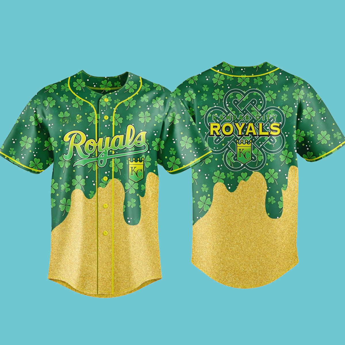 This classic button-front jersey features an emerald-green upper covered in shamrocks and light confetti-style dots for a festive all-over pattern that still feels clean. The front showcases the flowing Royals script with a crown-topped KC shield detail, while yellow piping along the collar and placket (plus matching yellow buttons) creates a crisp, structured finish. The lower half transitions into a dramatic gold “drip” effect for a celebratory, photo-ready vibe. On the back, KANSAS CITY ROYALS sits over a clover-knot inspired graphic with a centered KC shield, giving the design strong impact from every angle.
