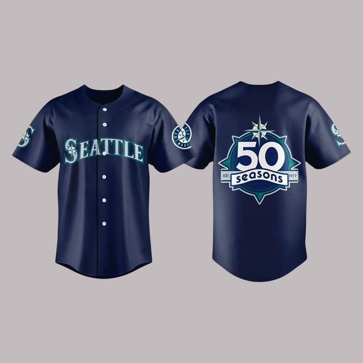 This beautifully crafted white jersey features a clean, classic button-up design with navy piping and the iconic “Mariners” wordmark across the chest in bold teal and navy blue. Both sleeves are adorned with signature compass rose patches, while the back of the jersey showcases a stunning “50 Seasons” emblem—honoring the team’s journey since 1977. This commemorative patch, with its dynamic starburst and stylized text, stands as a proud tribute to five decades of memories, fans, and legends. Every detail on this jersey is designed to reflect timeless tradition and the spirit of celebration.