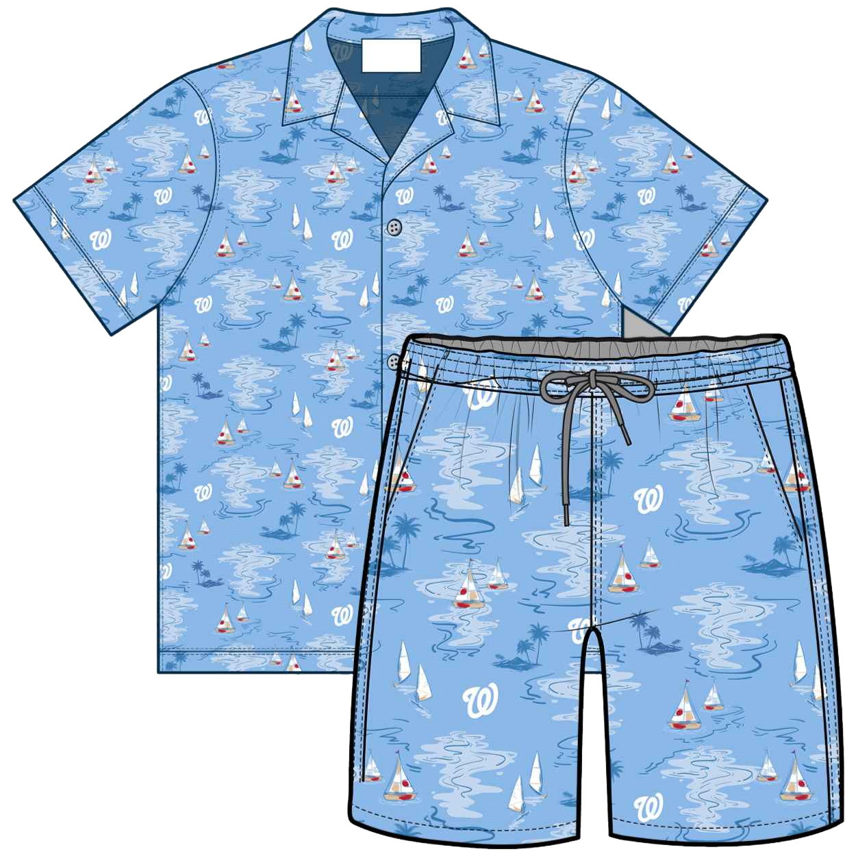 The 2026 Nationals Hawaiian Shirt & Shorts Set Giveaway features a light blue base covered in an all-over nautical pattern that includes sailboats, palm trees, gentle wave lines, and repeating “W” marks woven subtly into the artwork. The short-sleeve button-up shirt keeps a classic Hawaiian silhouette with a relaxed collar and easy fit, making it ideal for warm evenings. The matching shorts continue the same pattern for a cohesive look, finished with an elastic waistband and adjustable drawstring for comfort. Together, the set delivers a head-to-toe theme that stands out without feeling loud, balancing playful graphics with a clean, wearable palette.