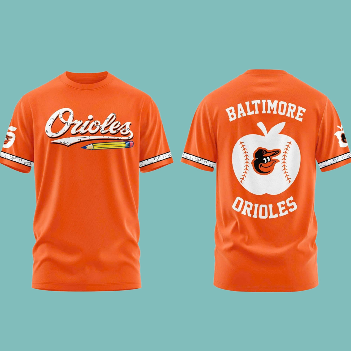 The 2026 Orioles Teacher Appreciation Night Shirt features a vibrant orange base that gives it a lively and standout look. The front graphic combines script-style lettering with a pencil detail, while the sleeve accents resemble ruler markings for a smart classroom touch. On the back, bold lettering and an apple-inspired baseball graphic add extra personality. With its classic crew neck and short sleeves, this shirt is easy to wear for school events, casual outings, and everyday style.