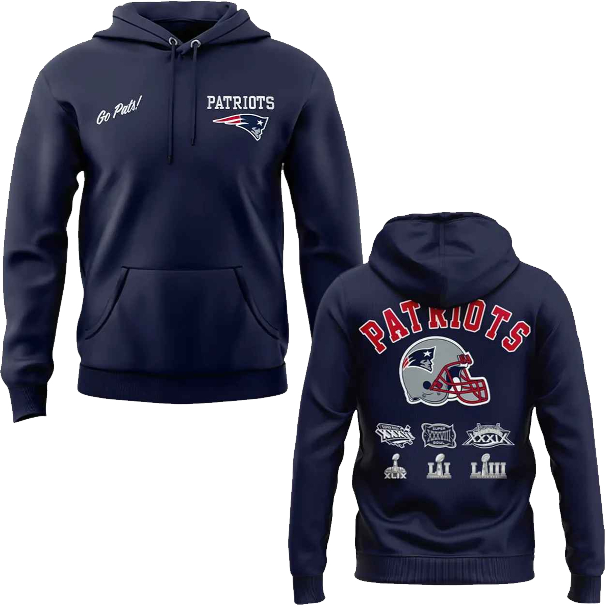 The inspiration behind the 2026 Patriots Navy Blue Hoodie comes from the team’s long-standing presence in championship games across multiple eras. On the back, the helmet graphic paired with championship numerals represents a timeline of greatness, marking iconic title runs that shaped modern football history. The front keeps things minimal and sharp with a clean “Patriots” wordmark and a subtle “Go Pats!” script, making this hoodie wearable far beyond game day. It’s a visual balance between heritage and everyday streetwear appeal.