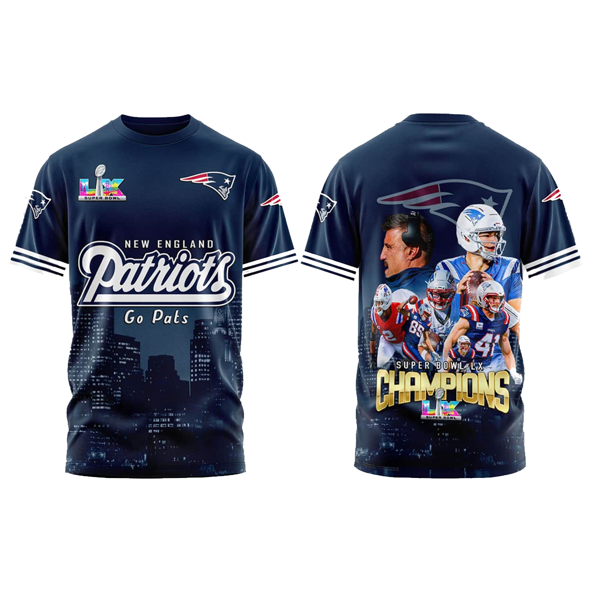The 2026 Patriots SB LX Champions Skyline Shirt features a detailed, full-color layout that blends championship symbolism with urban energy. The front showcases a bold “New England Patriots – Go Pats” script layered over a night-time city skyline, creating depth and motion that immediately draws the eye. Subtle lighting effects give the skyline a cinematic feel, symbolizing the city standing behind the team throughout the season.