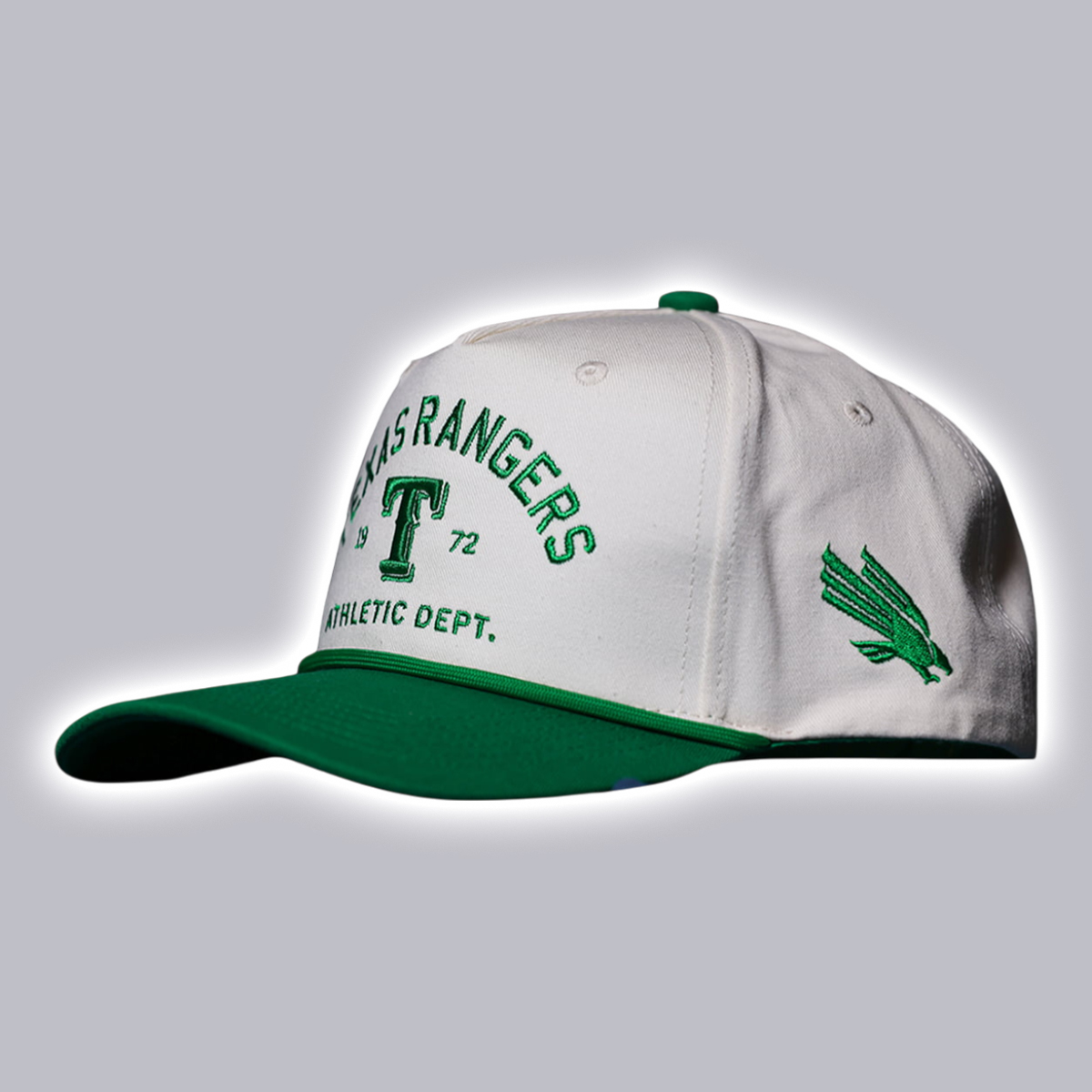 Refresh your rotation with the 2026 Rangers University of North Texas Cap Giveaway, a structured cap designed with a timeless two-tone palette and detailed embroidery that stands out without being loud. The crown comes in a clean white that keeps the look sharp and versatile, while the deep green curved brim adds a strong, sporty contrast that pairs well with almost anything in your closet. Across the front, arched lettering reads “TEXAS RANGERS,” framing a bold “T” at center for a classic athletic-department vibe. Small “19” and “72” details add a vintage-inspired touch, and “ATHLETIC DEPT.” stitched below completes the throwback campus feel. A subtle green trim line where the crown meets the brim adds a polished finish that makes the cap look more elevated than a standard everyday hat. On the side panel, a sleek wing emblem stitched in green gives the design extra personality and makes the cap look great from profile angles—perfect for photos and fits where details matter. Clean panel stitching, breathable eyelets, and the curved-brim silhouette make this cap comfortable for long wear, whether you’re commuting, traveling, walking outdoors, or heading to a weekend event. It’s the kind of cap that feels simple at first glance, then impresses up close with its stitching, color balance, and heritage styling.