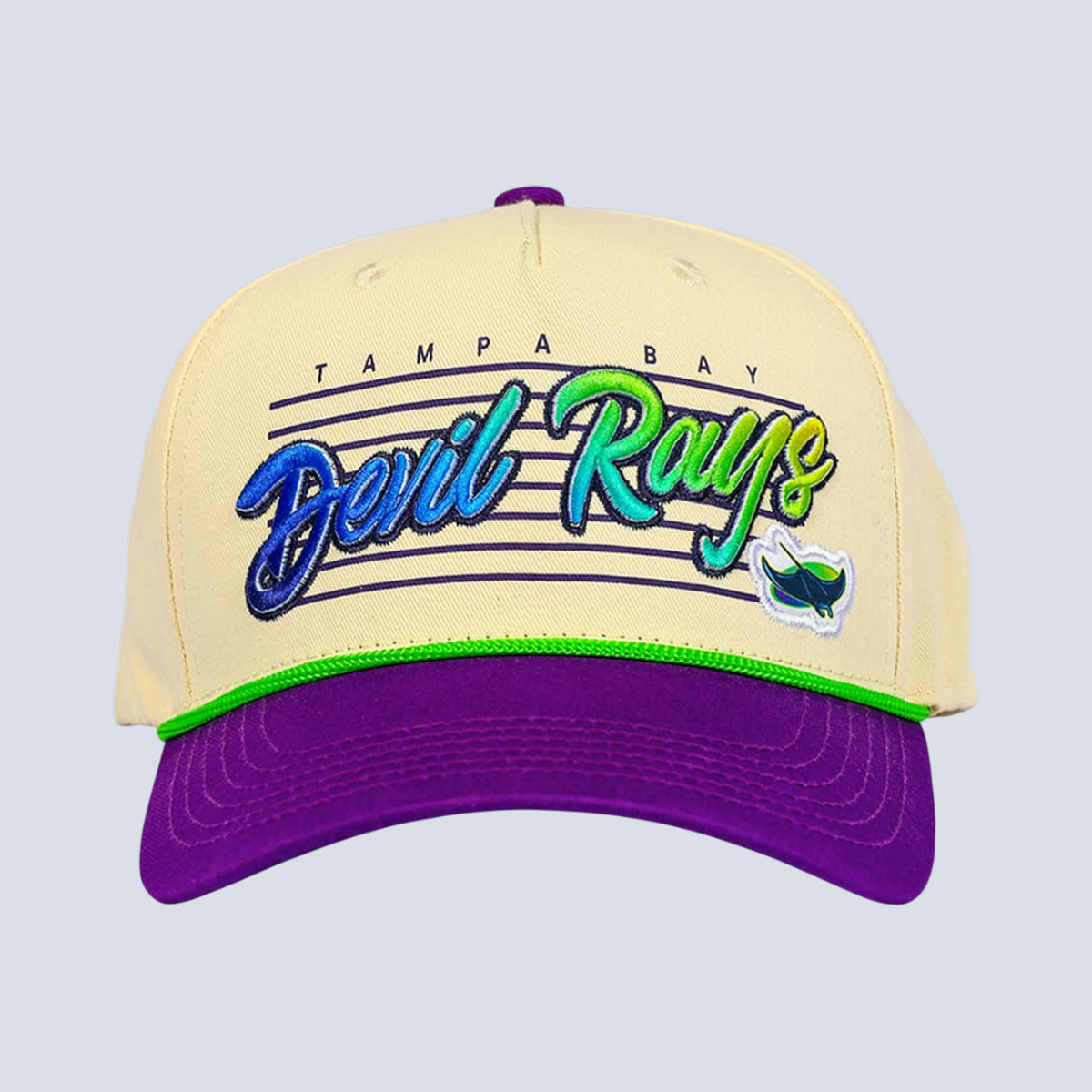 The 2026 Rays Devil Rays Retro Snapback Cap Giveaway features a cream-colored crown that sets the tone for its nostalgic aesthetic. Across the front panel, the “Devil Rays” script logo flows in dynamic blue and green gradient embroidery, accented with horizontal pinstripe-style lines that amplify the retro vibe. The detailed stitching creates depth and texture, making the logo pop against the lighter background. A bold purple curved brim anchors the design, while a bright green rope detail stretches across the front panel above the brim, delivering classic rope-hat character. The structured snapback build ensures a firm, confident shape, while the adjustable closure provides a customizable fit.