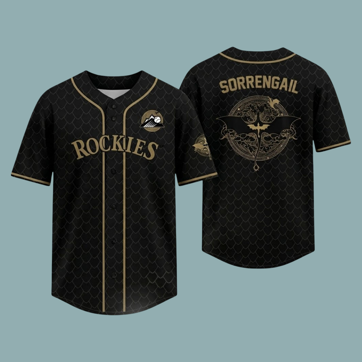 The 2026 Rockies Fourth Wing Night Giveaway Jersey features a striking black base with gold accents, creating an elegant and bold look. The front of the jersey proudly displays the “ROCKIES” logo in gold, with a unique mountain design on the left sleeve, symbolizing the team’s roots. The back of the jersey showcases “SORRENGAIL” with a detailed, intricate graphic of a bat—drawing inspiration from the Fourth Wing Night theme. The design stands out with its combination of subtle patterns and strong visual elements, making this jersey a collector’s item for any fan. It’s a perfect blend of team spirit and a touch of fantasy, making it ideal for game days or any special occasion.