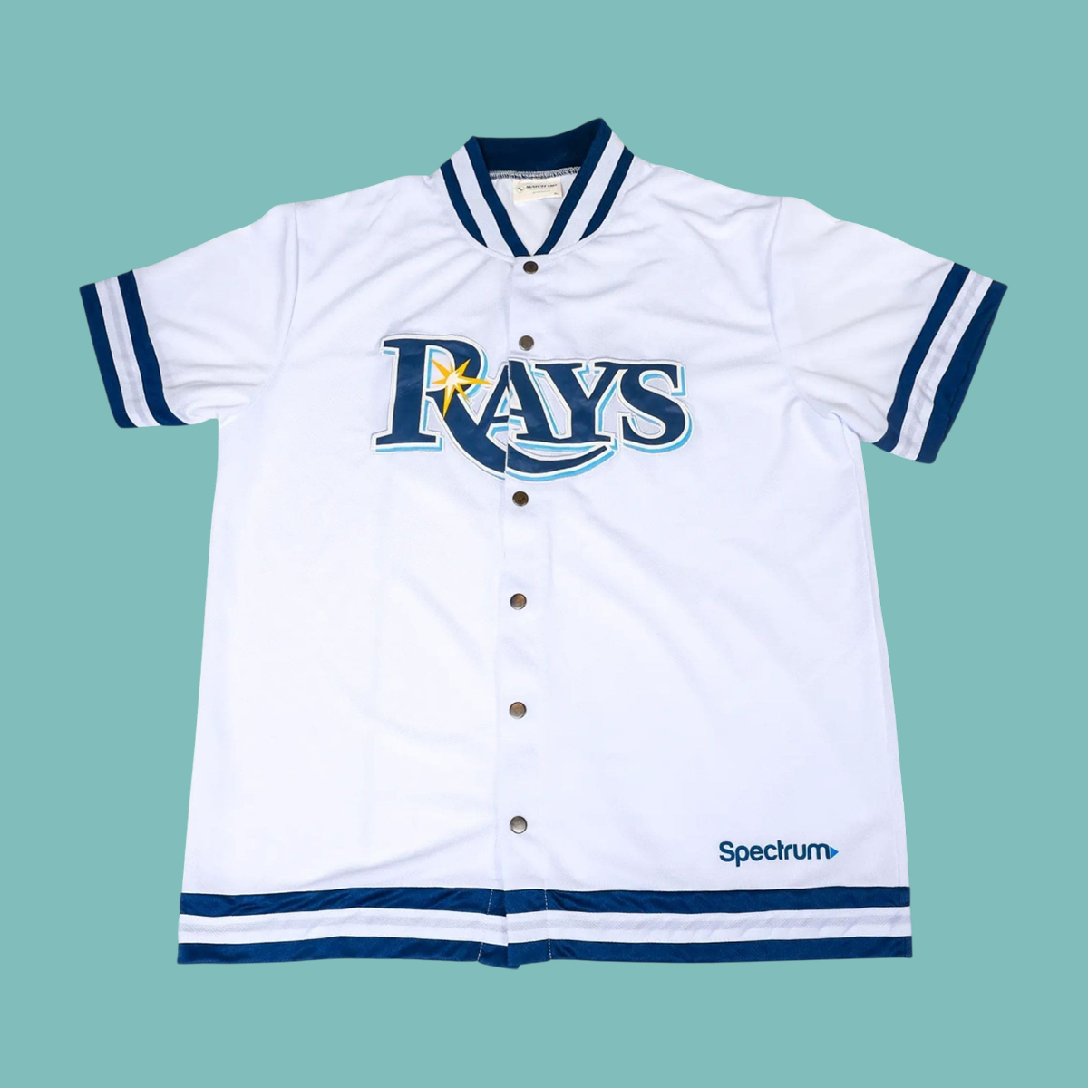 This standout garment features a crisp white body crafted from a durable yet breathable fabric, accented by deep navy and light blue detailing. The front is dominated by the iconic “Rays” wordmark with its signature yellow sunburst, applied in a high-quality textured finish. Unlike a standard shirt, this 2026 Tampa Bay Rays Giveaway Jersey Jacket hybrid features a snap-button front and a ribbed varsity-style collar and hem with athletic striped patterns. The bottom right features a sharp “Spectrum” sponsor logo, adding a touch of authentic promotional flair to the overall design.