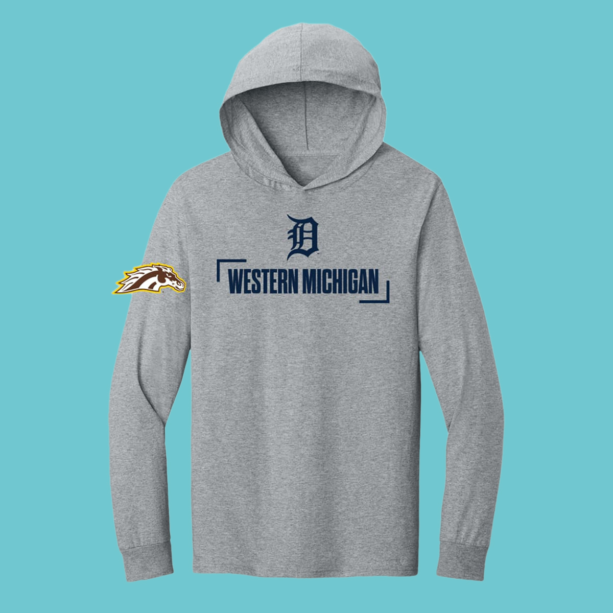 The 2026 Tigers Western Michigan University Hoodie Giveaway comes in a versatile heather gray with a comfortable hood and long sleeves, featuring a bold “WESTERN MICHIGAN” wordmark across the chest framed by minimalist lines, a classic Old English-style “D” above it, and a standout Broncos-inspired sleeve graphic that adds extra personality without overpowering the design.