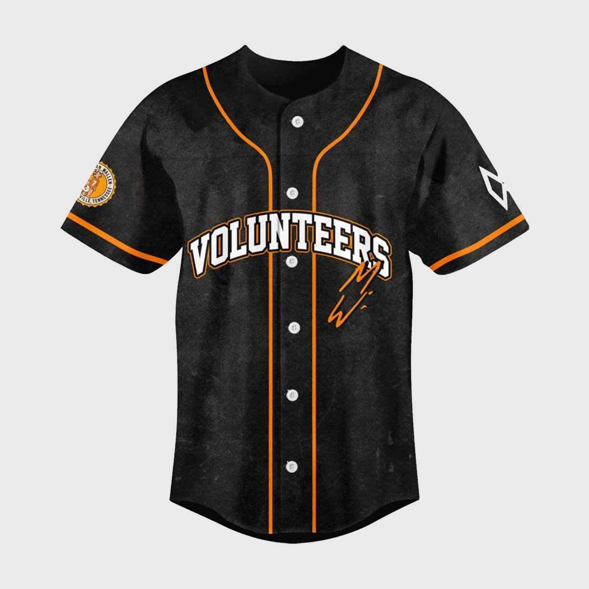 This jersey features a deep black, vintage-washed base that immediately sets a gritty, concert-ready tone. The front showcases the bold “Volunteers” lettering across the chest, accented with clean orange piping that runs vertically along the button line and around the sleeves, creating a classic athletic silhouette with a modern edge. A sharp lightning bolt graphic adds an extra layer of intensity, reinforcing the high-energy vibe tied to live performances.