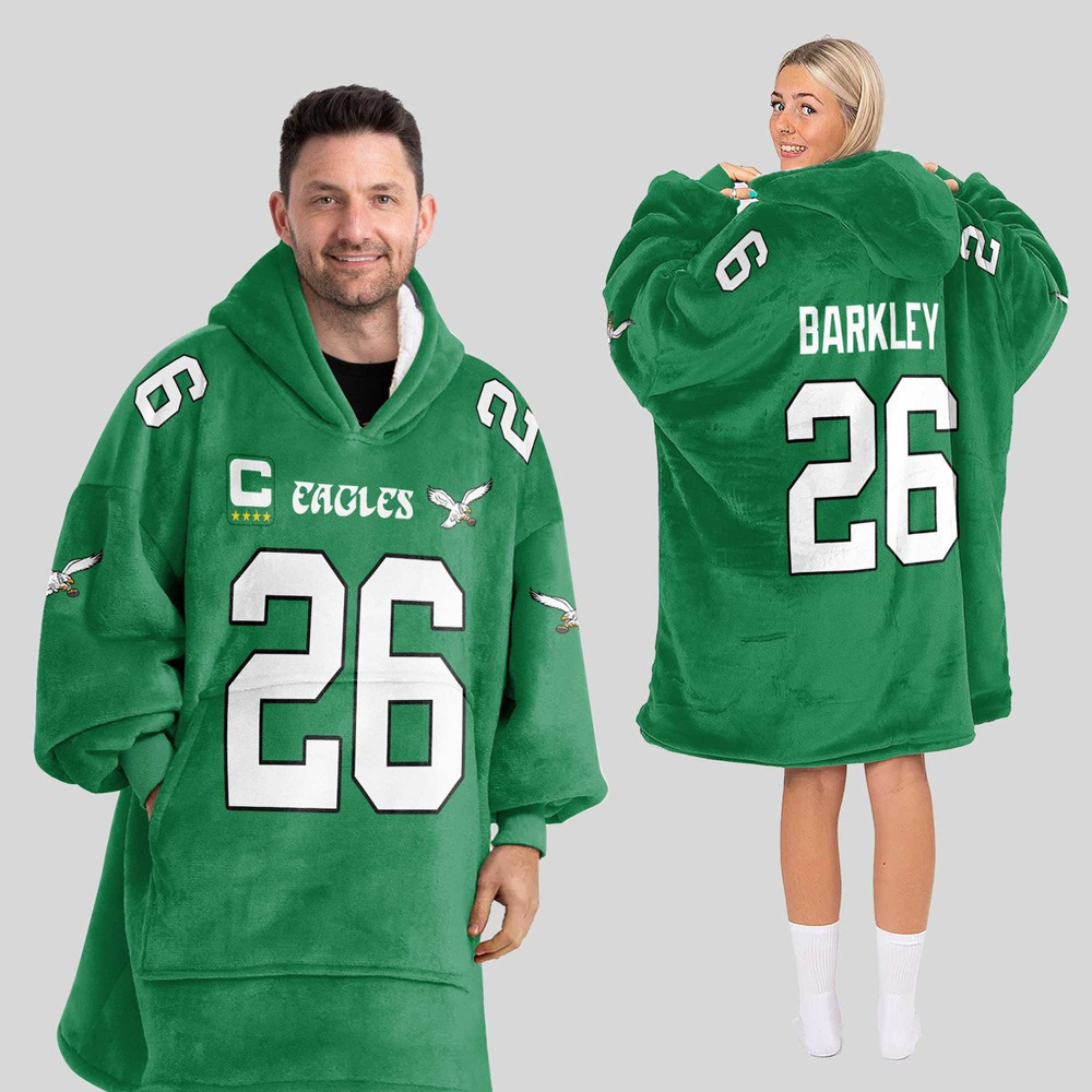 This 26 Eagles Football Unisex Blanket Hoodie is crafted for maximum comfort and style. Made from an incredibly soft, plush fleece material, it feels like a warm hug. The front of the hoodie proudly displays the captain’s C with four stars, EAGLES and the number 26, along with the iconic eagle logo on the sleeves. On the back, you’ll find BARKLEY and the number 26, paying tribute to the team’s star running back.