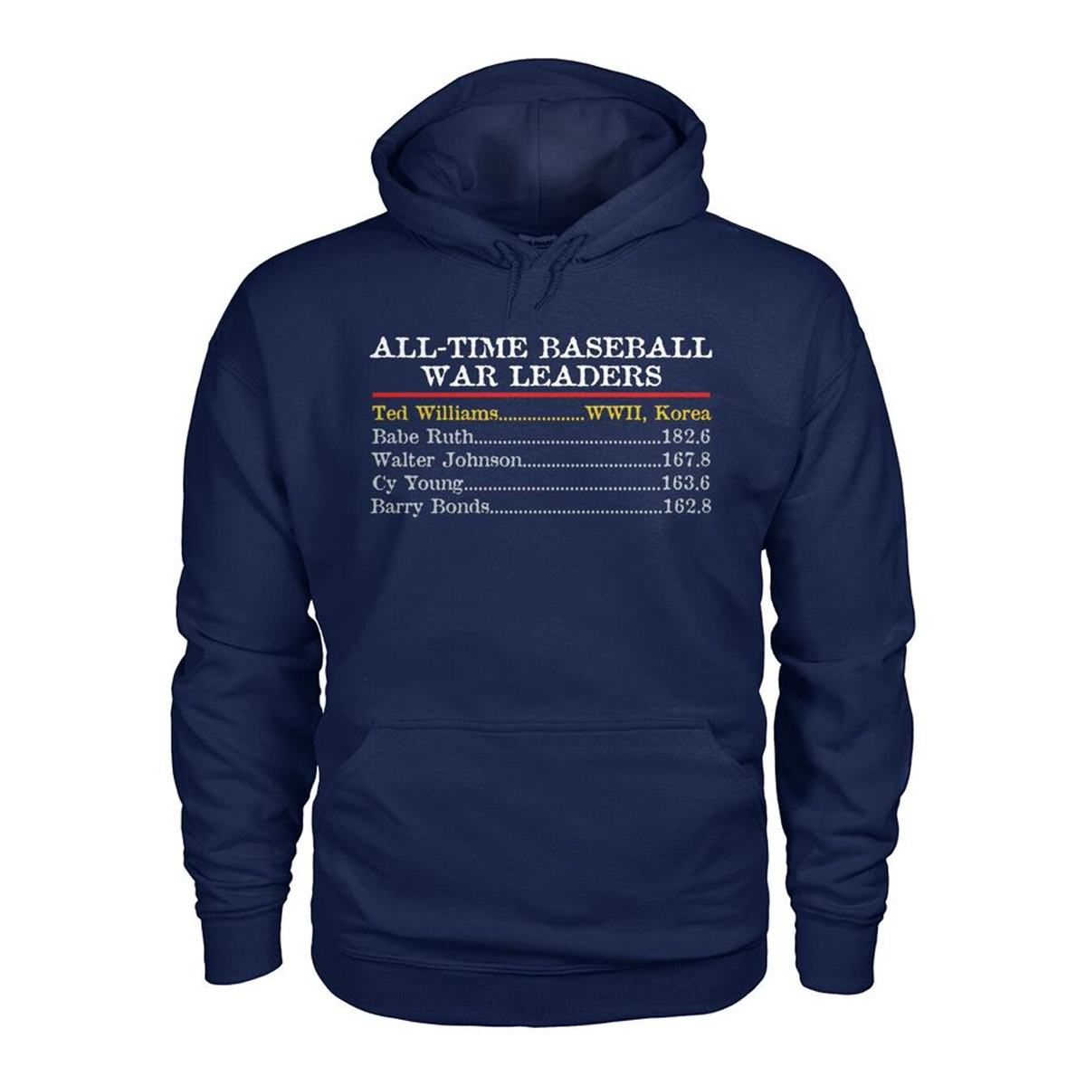 The All Time Baseball War Leaders Shirt is a sophisticated and thought-provoking tribute to some of the greatest players in the history of the sport, seen through the lens of one of its most respected advanced statistics. The inclusion of figures like Babe Ruth, Walter Johnson, Cy Young, Barry Bonds, and the unique detail next to Ted Williams, mentioning his service in WWII and Korea, elevates the garment beyond simple fandom, turning it into a piece of wearable baseball history and analytical appreciation.