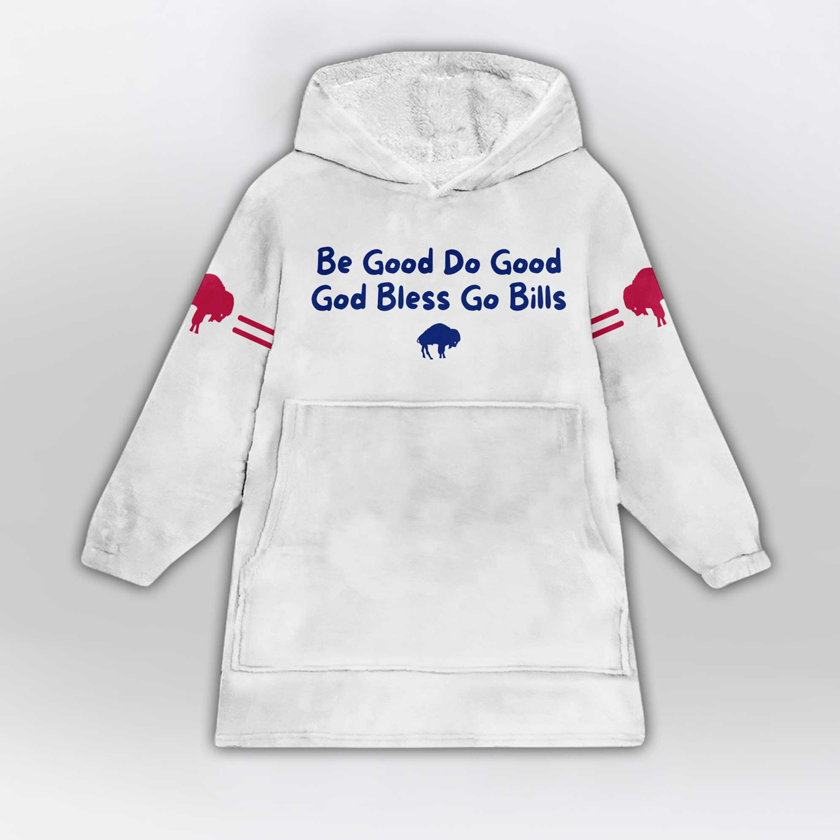 Made in a crisp white hue that mirrors the clean, bold energy of Buffalo winters, this oversized hoodie blanket is more than just cozy wear, it’s a statement of character and community. The front features the iconic phrase “Be Good Do Good God Bless Go Bills” in deep blue print, accented by red buffalo silhouettes on each sleeve, symbolizing the unity and resilience of fans who never give up on their team.