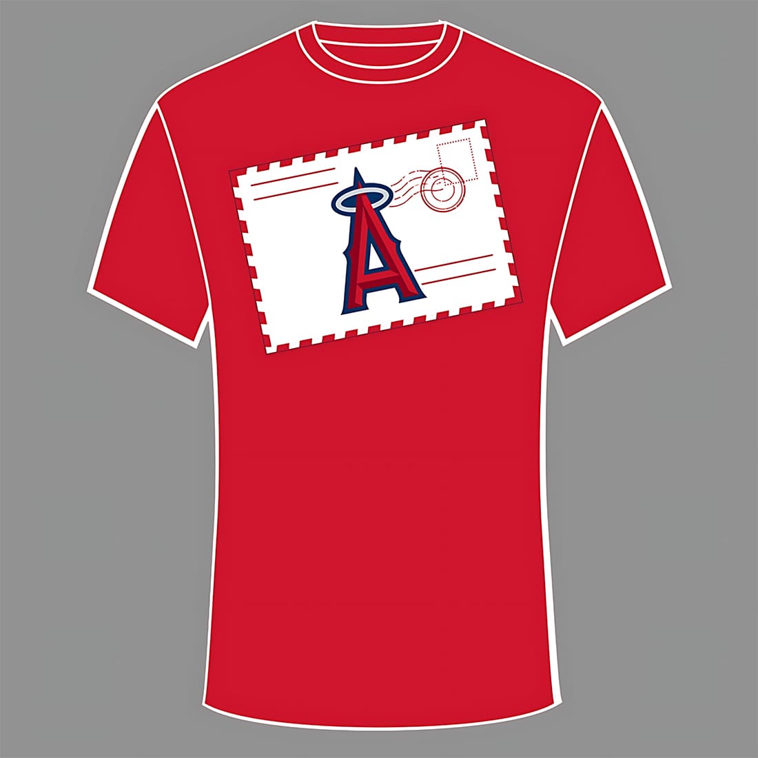 The shirt features a postcard-inspired design with the iconic Angels “A” logo and halo on a crisp white rectangle, complete with stamped edges and playful postmark lines. The bold red background makes the design pop, while the lightweight fabric ensures all-day comfort perfect for cheering or just looking like the MVP of style.