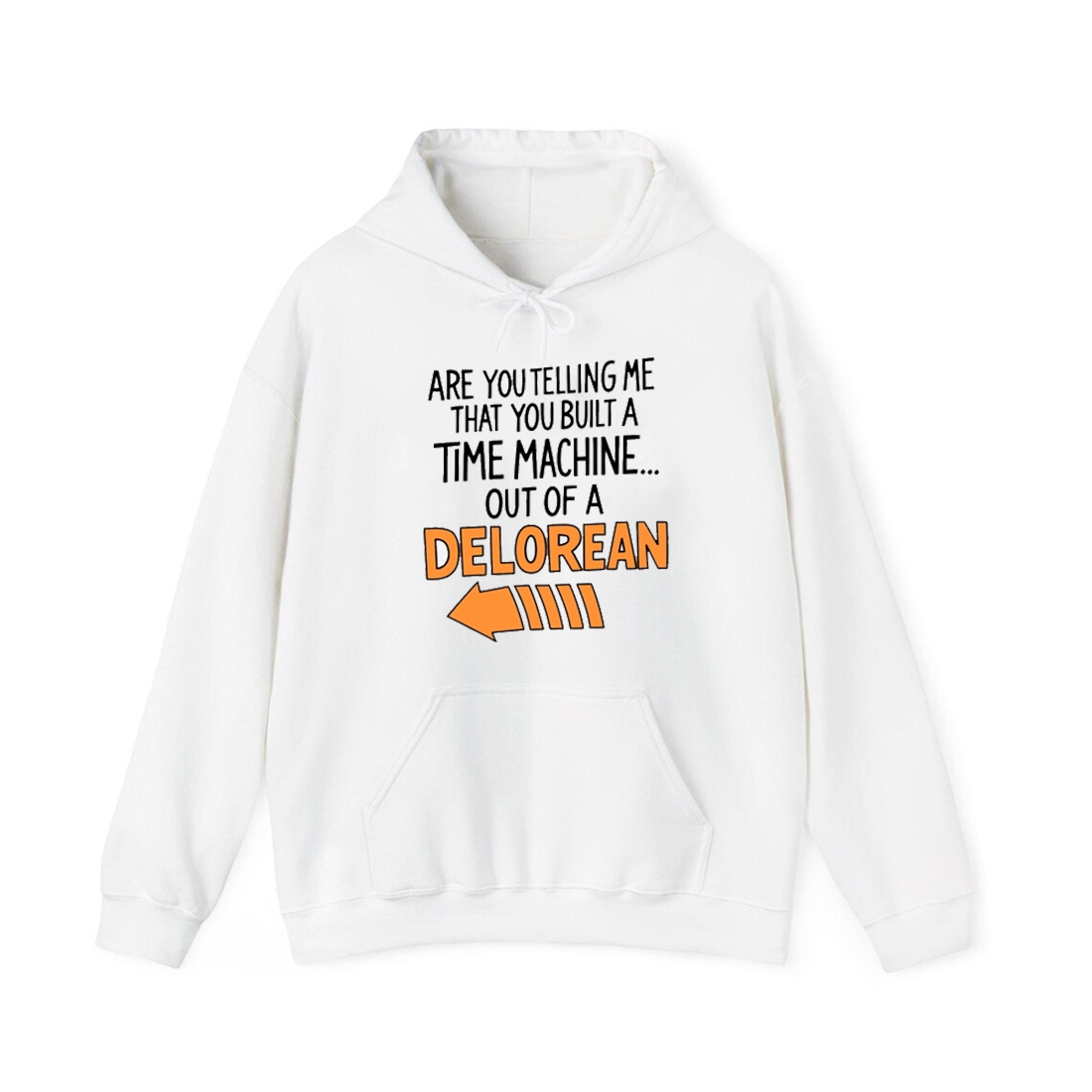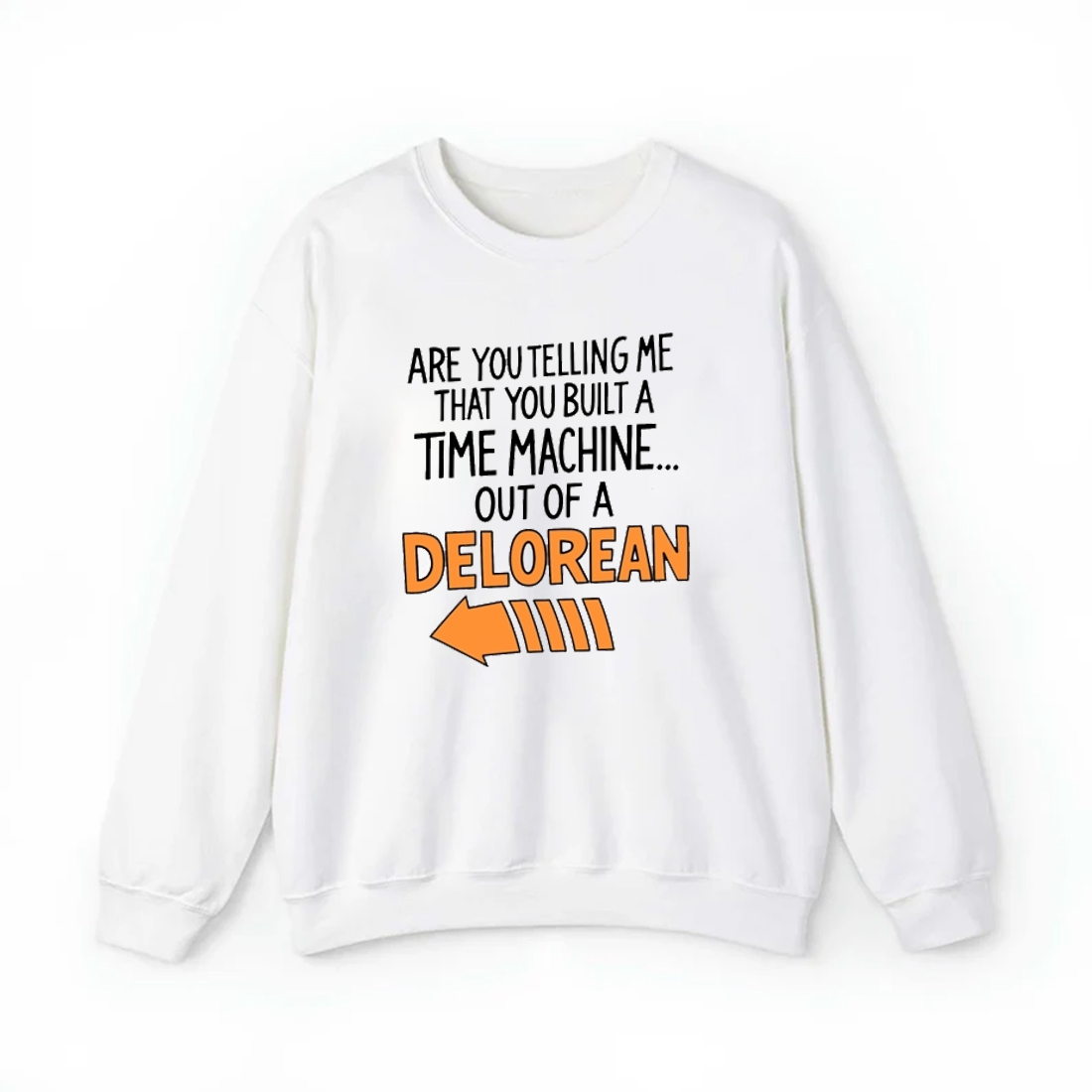 This witty shirt features the unforgettable line, “ARE YOU TELLING ME THAT YOU BUILT A TIME MACHINE… OUT OF A DELOREAN,” complete with a stylized orange arrow and speed lines pointing toward the iconic vehicle name. The phrase itself instantly transports the wearer and observers back to a moment of brilliant, disbelief-filled comedy and adventure. The mix of hand-drawn-style fonts and the vibrant orange accent on the key word “DELOREAN” and the graphic element make the design both fun and attention-grabbing against the clean white background.