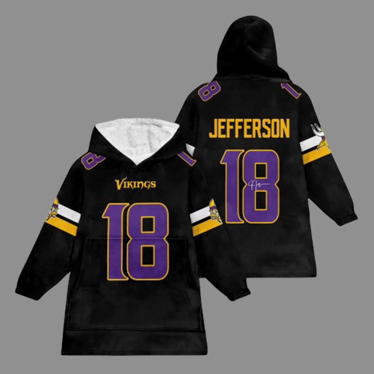 This blanket hoodie features a rich purple base that immediately connects to Minnesota football tradition. The oversized 18 dominates the front in crisp white, creating a strong contrast that pops from a distance. Yellow and white striping on the sleeves adds depth and movement, while subtle Viking-inspired accents reinforce the team identity. On the back, JEFFERSON is displayed proudly above the large 18, finished with an autograph-style graphic that adds a collector-like touch to the design.
