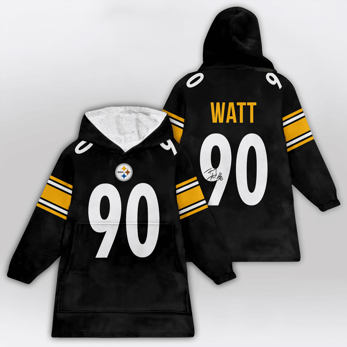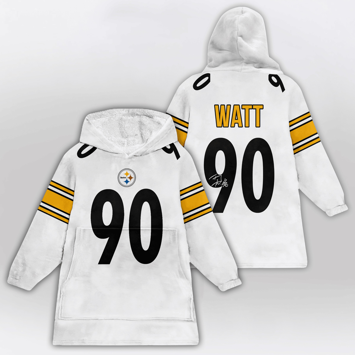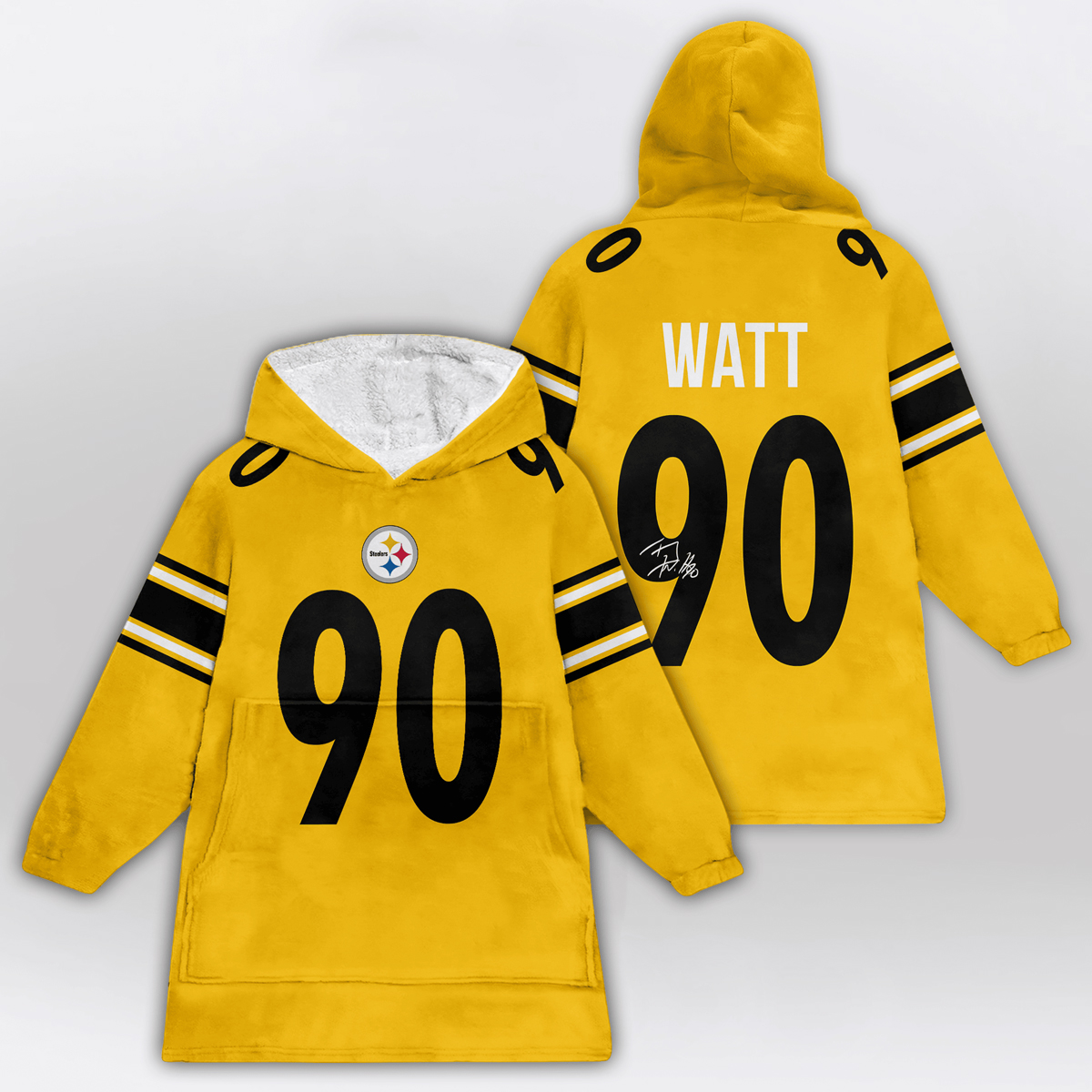 This blanket hoodie features a bold gold base that instantly reflects Pittsburgh’s iconic football identity. The oversized 90 is printed prominently on both the front and back in deep black, creating striking contrast and instant recognition. Across the upper back, the name WATT adds authority, while the stylized autograph graphic near the number elevates the design with collector-style appeal. Black sleeve stripes reinforce the tough, traditional look, while the hood’s plush inner lining delivers maximum warmth.
