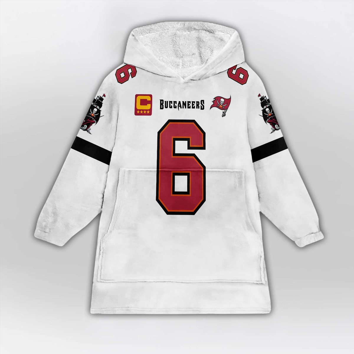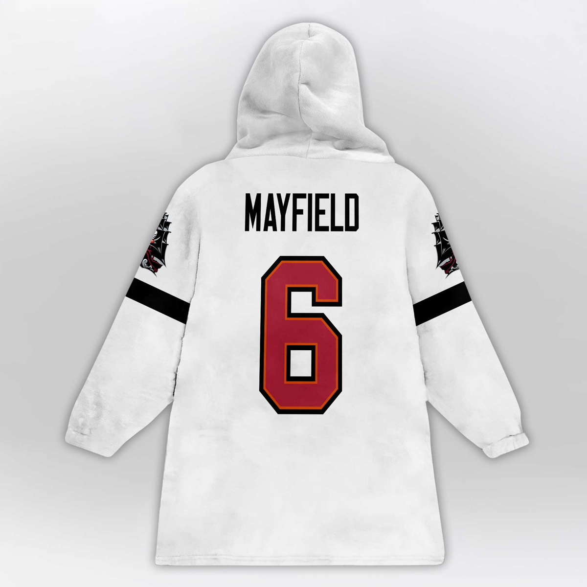 This blanket hoodie features a clean white base that highlights the deep red 6 front and center, outlined for sharp contrast and instant recognition. The chest area includes captain-style detailing alongside Tampa Bay football graphics, reinforcing the theme of leadership and responsibility. Black sleeve bands add balance and edge, while subtle accents on the shoulders tie the design together. Turn it around and the back displays MAYFIELD above the oversized 6, creating a strong, confident look from every angle.
