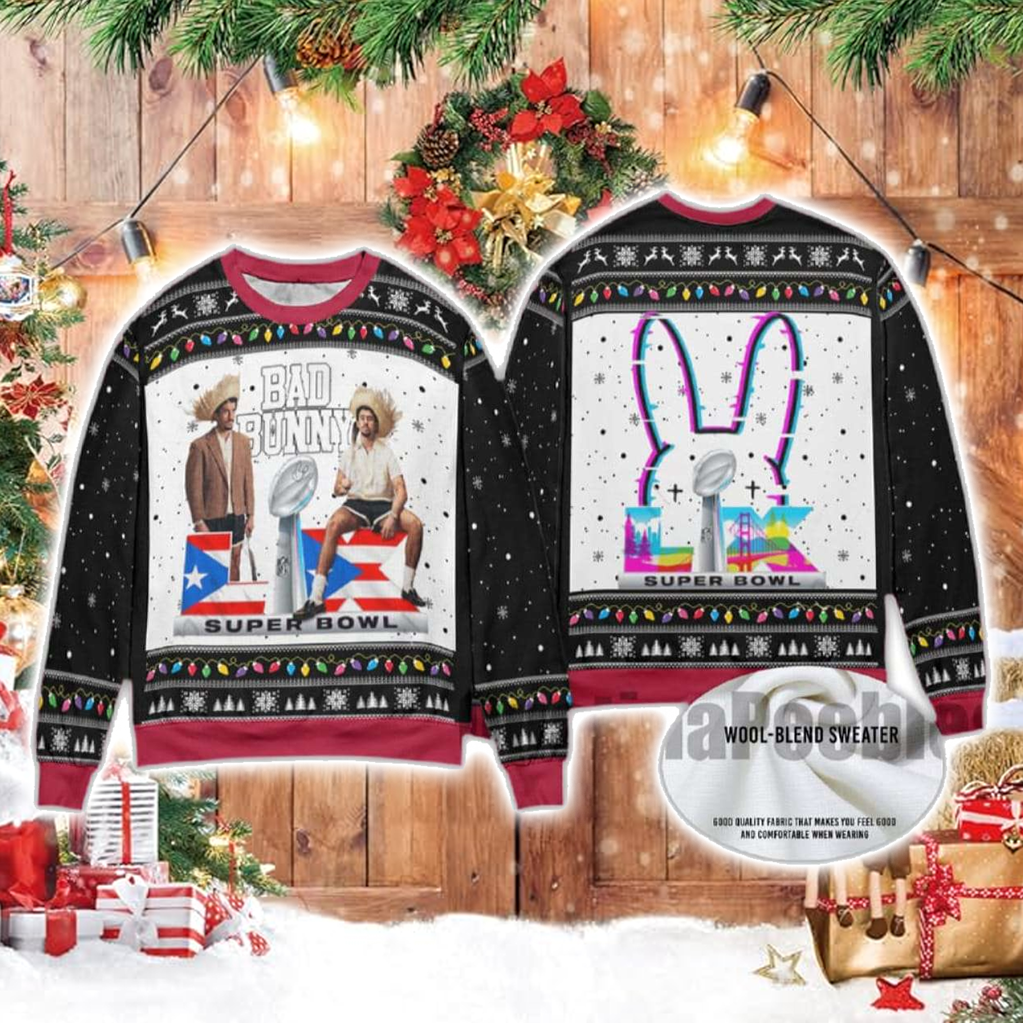 The back of the sweater continues the celebration with a neon outline of Bad Bunny’s signature bunny logo, glowing above the Super Bowl city skyline. Bright rainbow accents, holiday motifs, and snowflake details tie the whole design together in perfect balance festive enough for Christmas, yet edgy enough for fans of modern pop culture.
