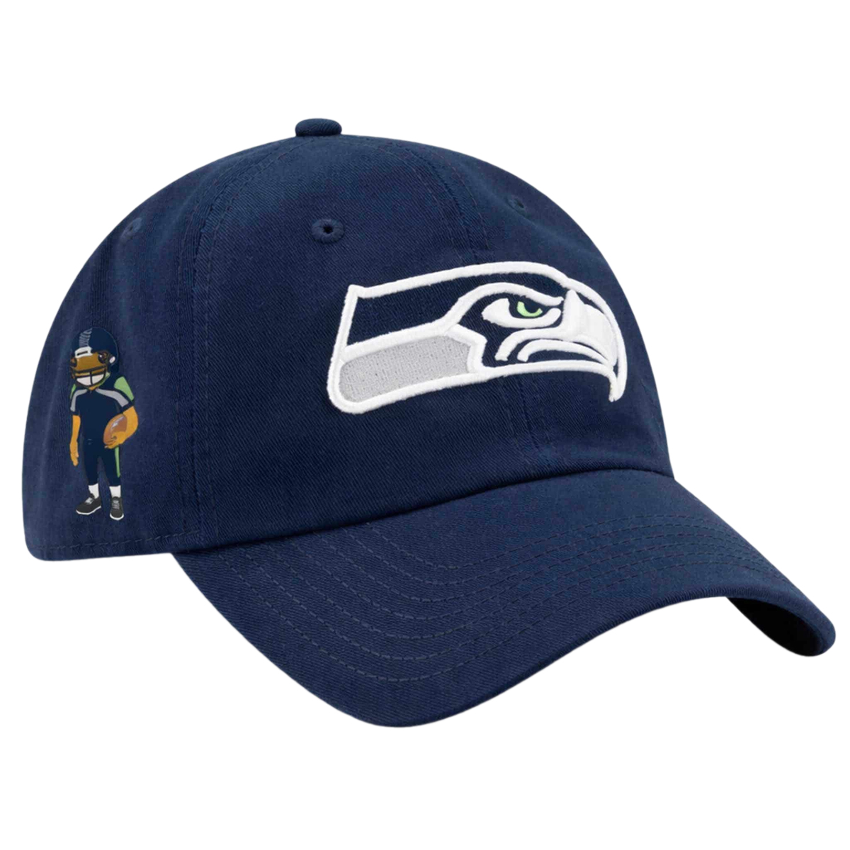 What elevates this hat is the side detail: a small illustrated football character inspired by Bad Bunny’s playful, boundary-pushing visual language that influenced sports-adjacent fashion throughout 2026. This subtle graphic adds personality and narrative, an insider nod that rewards closer looks while keeping the overall aesthetic refined. Vent eyelets enhance breathability, and the structured panels help the hat keep its shape wear after wear. The navy palette anchors the piece in Seattle’s identity, while the thoughtful accents reflect a year when individuality mattered as much as allegiance.