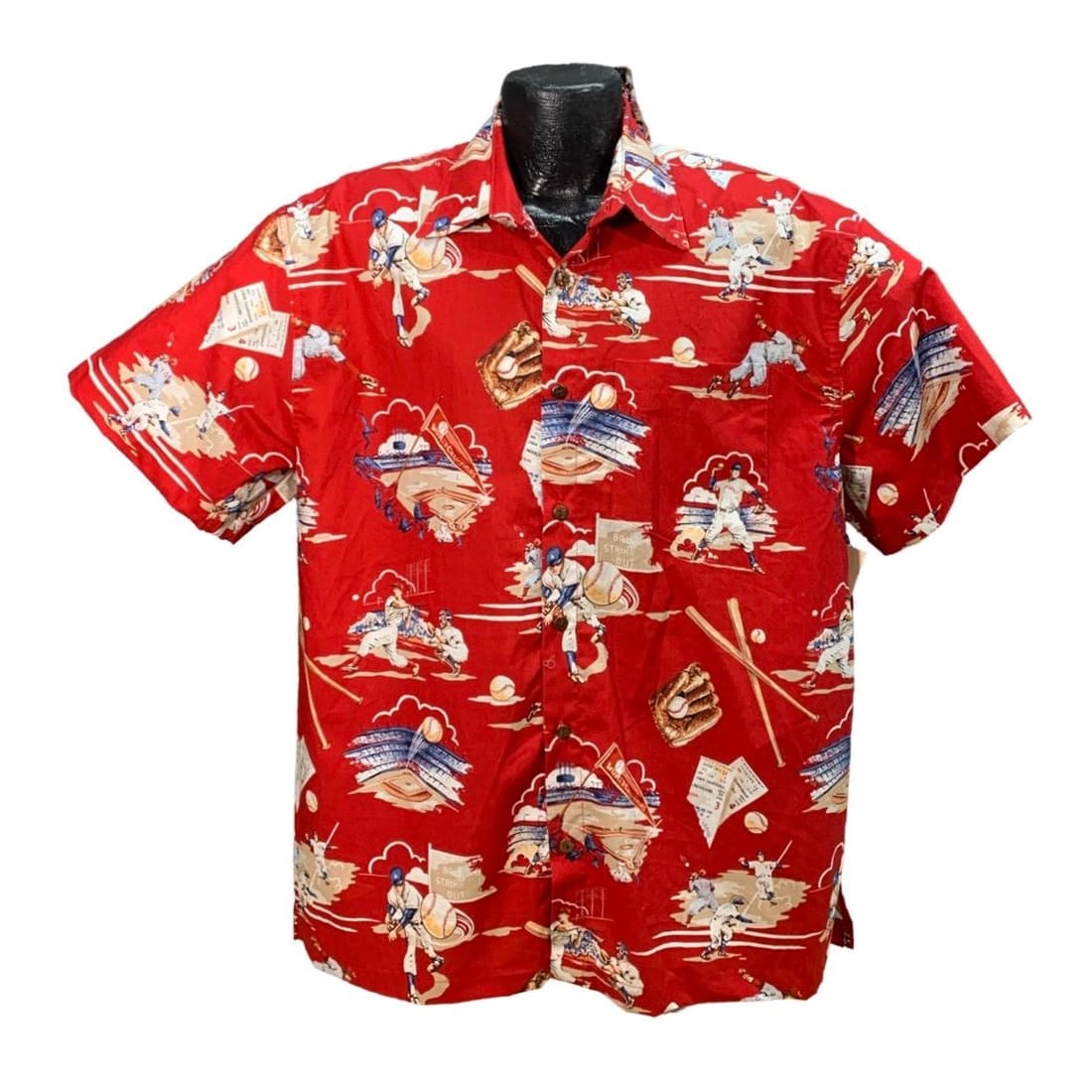 This eye-catching short-sleeved Hawaiian shirt features a bold red base layered with vibrant illustrations that tell a visual story of baseball’s golden era. From legendary players swinging bats to vintage baseball gloves, bats, and flying baseball every element on this shirt is designed to evoke the spirit of the game. The all over graphic also features dynamic stadium scenes, scoreboards, and gameplay action that capture the excitement of baseball’s history.