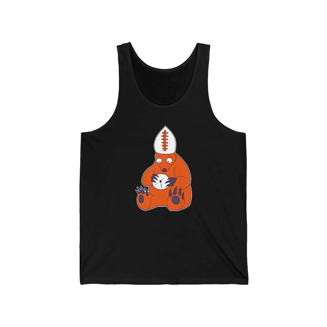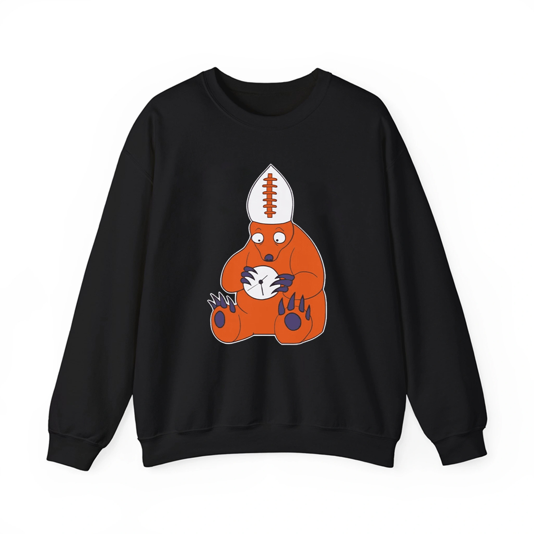 The Bears Cursed Pope Shirt features a bold cartoon-style illustration centered on a deep black base. At the heart of the design is an orange bear sitting down, wide-eyed and visibly uneasy, wearing a papal-style hat shaped like a football. In its paws, the bear clutches a cracked clock, symbolizing time slipping away missed chances, late-game collapses, and seasons that feel doomed before they ever begin.