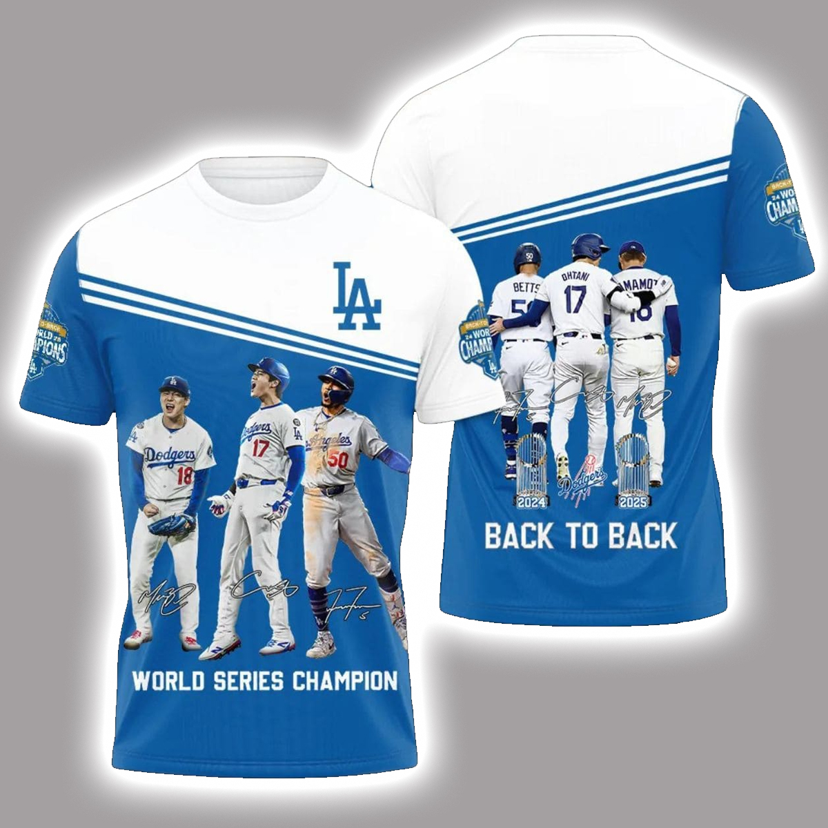 This Betts Ohtani Yamamoto Back To Back World Series Champion T-Shirt features eye-catching front and back designs that highlight three of baseball’s brightest stars. The front displays stunning full-color graphics of Betts, Ohtani, and Yamamoto in action, each with printed signatures, set against the iconic blue and white team colors. The back shows the trio walking shoulder to shoulder toward two shining trophies labeled 2024 and 2025, with the words “Back To Back” boldly printed underneath because two titles say it all.