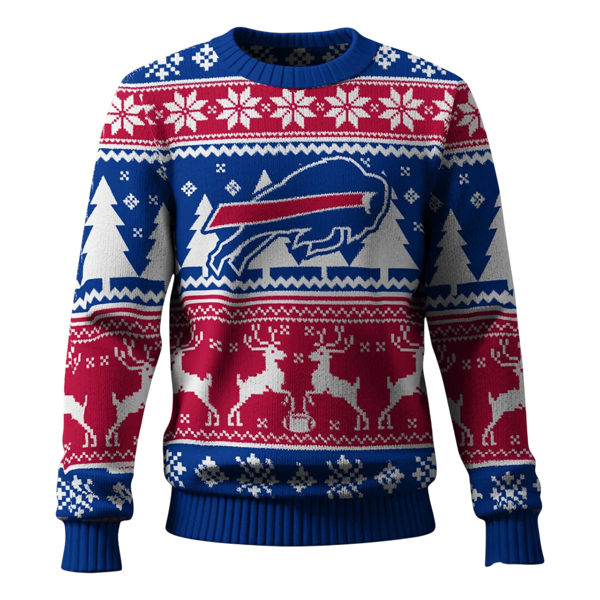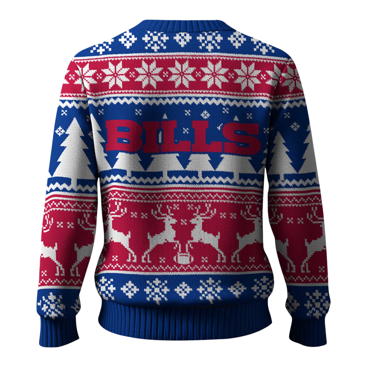 The Bills Reindeer Football Christmas Ugly Sweater captures the essence of winter celebration with a vibrant mix of royal blue, red, and white. The powerful buffalo emblem stands proudly at the center, framed by rows of snowflakes, pine trees, and playful reindeer holding a football. Each pattern is knitted with precision, creating a handcrafted feel that’s as nostalgic as it is modern. The color contrast gives it a lively, high-energy look that shines at any festive event.