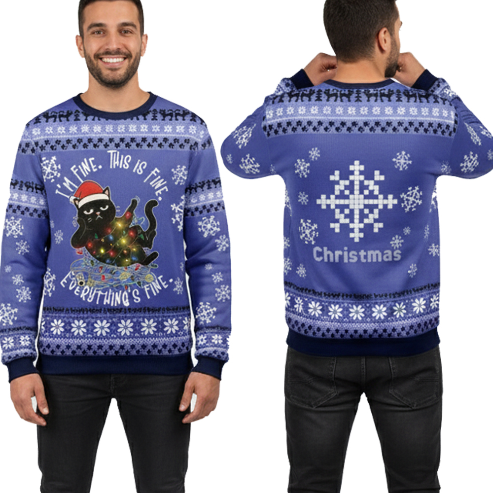 This vibrant, blue sweater features a whimsical yet deeply relatable design. The text I’m Fine, This Is Fine, and Everything’s Fine is strategically placed around the cat, capturing the essence of feeling overwhelmed but trying to maintain composure. The festive background is decorated with classic Fair Isle patterns, including snowflakes and Christmas trees, all in a soothing white and navy blue palette. The back of the sweater continues the theme with a large, intricate snowflake and the simple text Christmas.