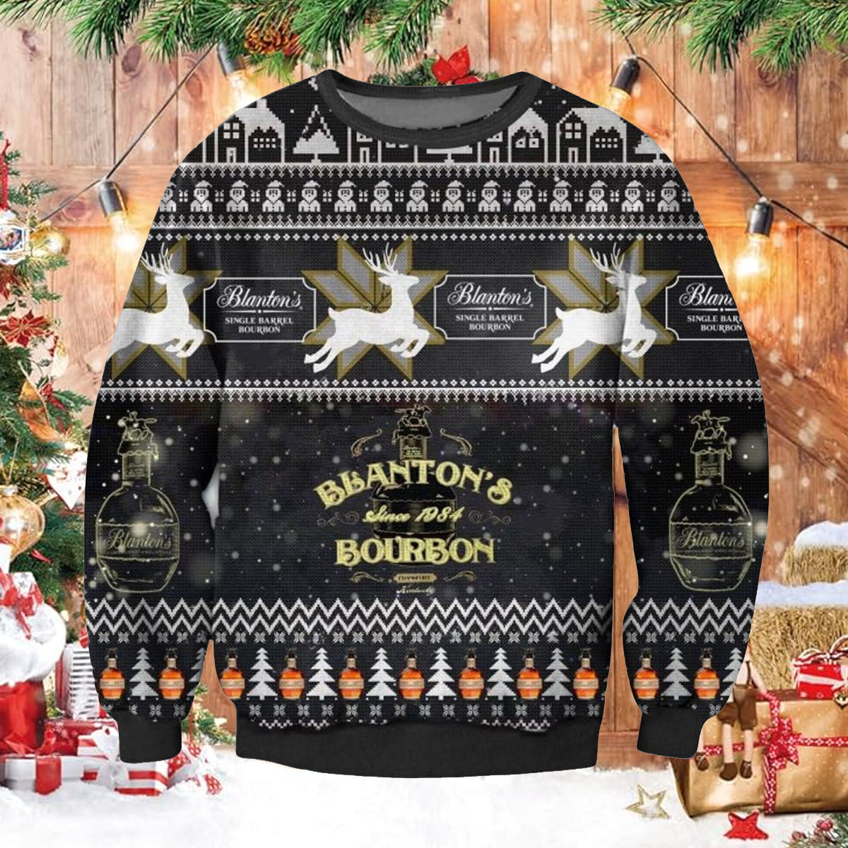 The main body of the sweater is a tribute to the celebrated spirit. The top section showcases a repeating pattern of leaping reindeer alongside the recognizable Blanton’s Single Barrel Bourbon label. The central focus features the brand’s main logo BLANTON’S since 1984 BOURBON in elegant gold and white lettering, set against a shimmering background. Flanking this logo are two large, detailed graphics of the iconic round bottle with its signature horse and jockey stopper.
