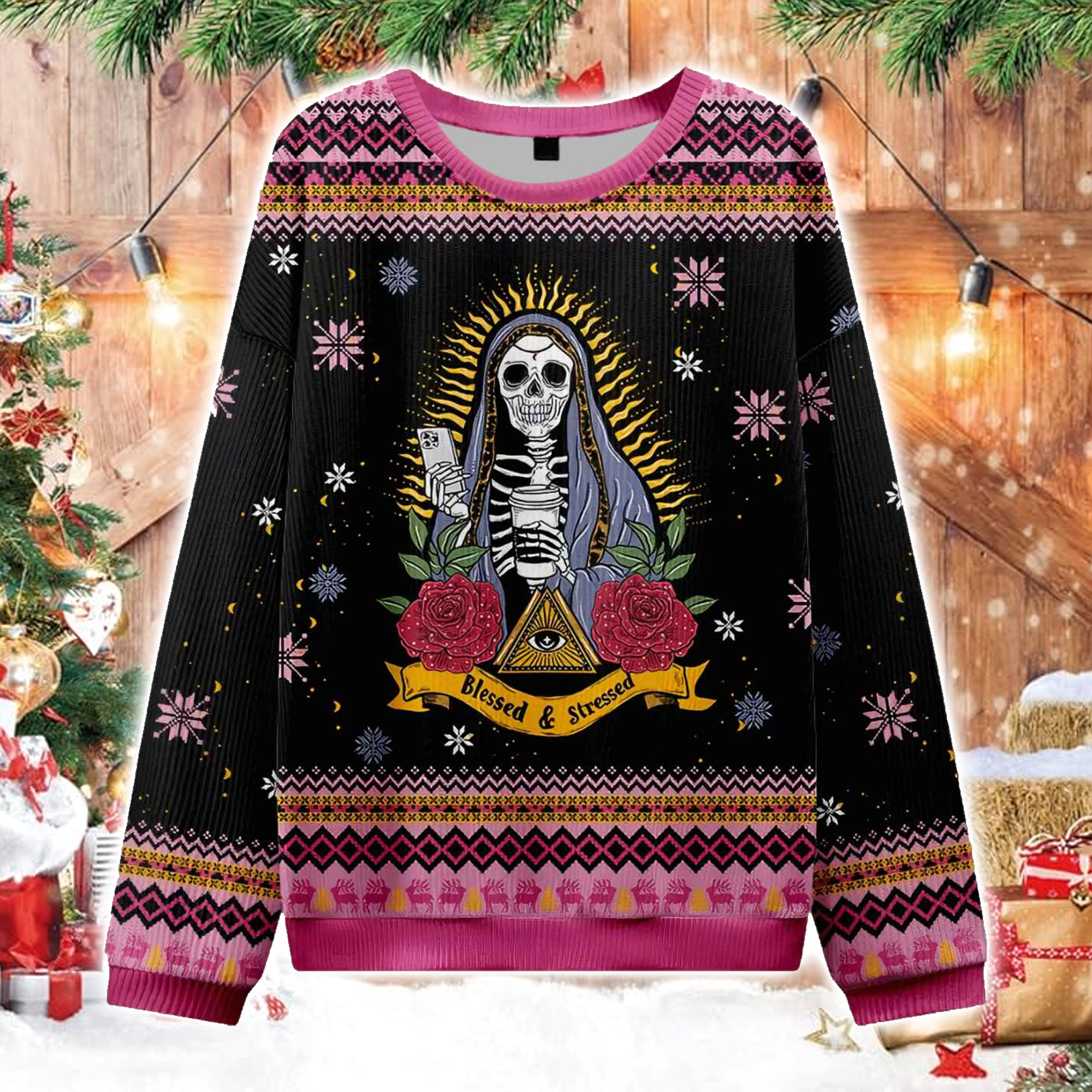 The Blessed And Stressed Ugly Christmas Sweater blends traditional festive motifs with modern, witty art. At its center, a radiant skeleton figure draped in serene blue robes holds a coffee cup in one hand and a phone in the other, the ultimate symbols of our daily grind. A golden aura surrounds the image, framed by vivid red roses and an all-seeing triangle, beneath a banner that proudly declares “Blessed & Stressed.”
