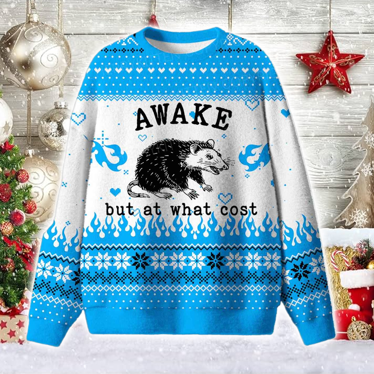 At the center of the sweater is a hand-drawn possum sitting in the midst of chaos wide-eyed, tired, and embodying the perfect mood of surviving the holidays. Above it is the bold word “AWAKE”, and below it the punchline: “but at what cost.” It’s the perfect representation of anyone running on holiday stress, late-night gift wrapping, or too many cups of coffee.