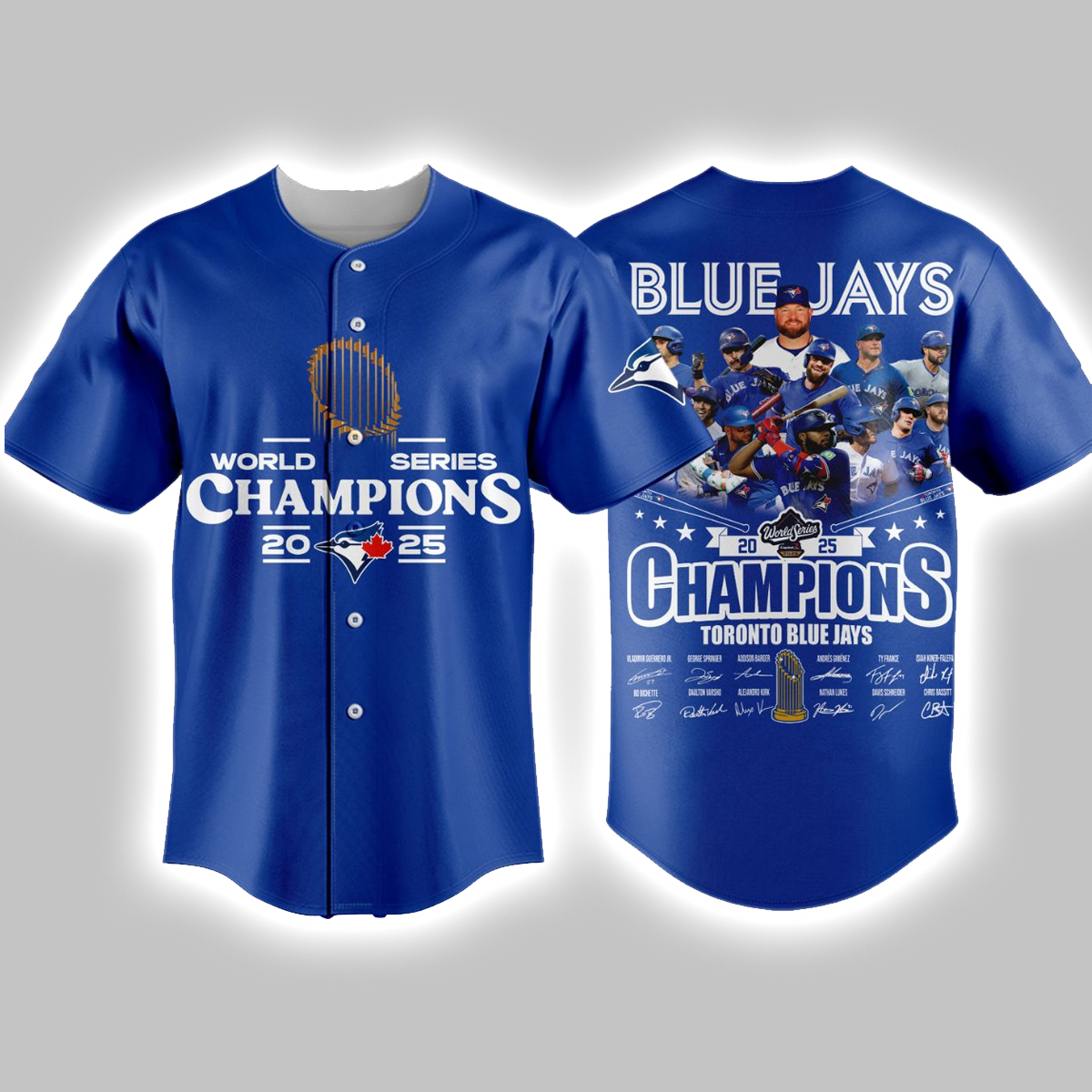 The Blue Jays 2025 World Series Champions Signature Jersey captures the unforgettable journey to victory with bold, detailed graphics celebrating the championship win. The front proudly showcases the World Series Champions 2025 logo with a golden trophy accent, symbolizing the ultimate triumph in baseball. On the back, it features dynamic team imagery, the “CHAMPIONS” banner, and printed player signatures an iconic tribute to every name that made this victory possible. Whether displayed or worn, this jersey embodies team pride and Toronto spirit like no other.
