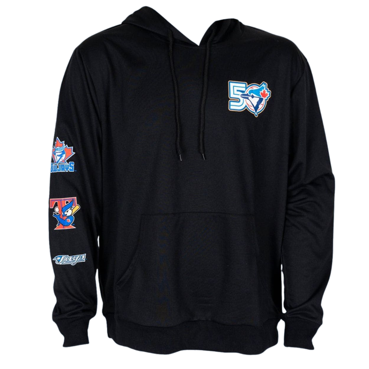 The Blue Jays 2026 Y2K Weekend Retro Hoodie features a clean black base that lets the graphics do the talking. On the chest, a retro-styled Blue Jays emblem paired with a bold “50” detail nods to milestone moments and vintage design language. The sleeves elevate the look even further, showcasing multiple throwback-inspired patches and graphics that reference different chapters of Toronto baseball history. The relaxed fit, kangaroo pocket, and adjustable hood make it ideal for cooler game nights, city wear, or casual layering year-round.