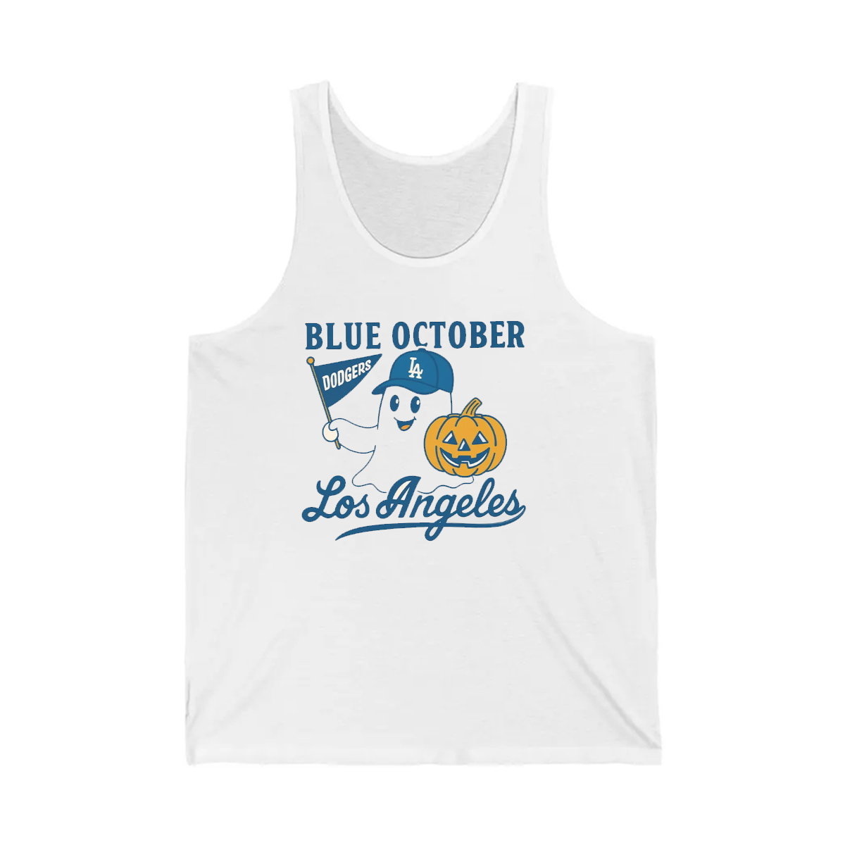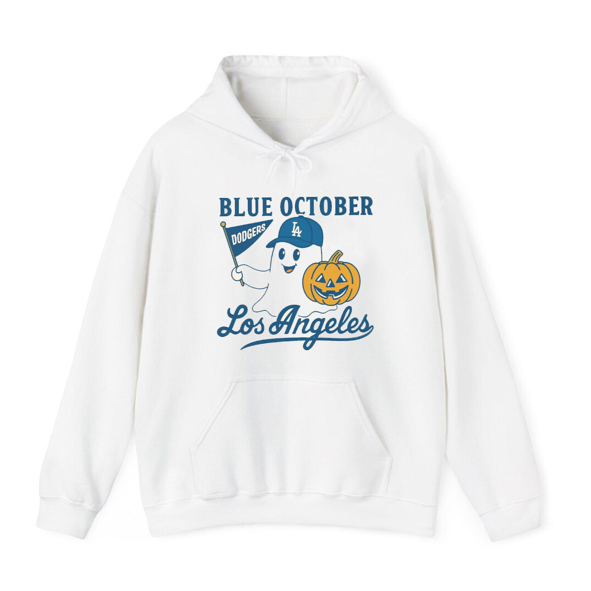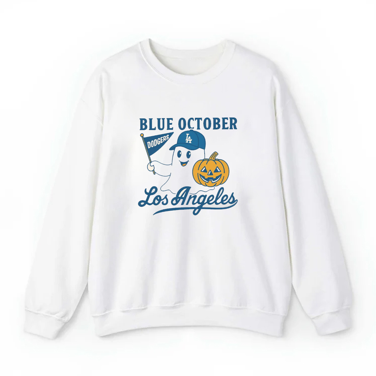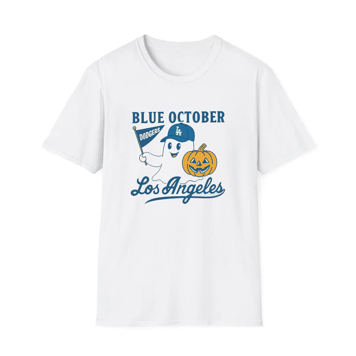 The Blue October Ghost Dodgers Shirt features a playful design of a friendly ghost wearing a Dodgers cap and holding a Dodgers flag. The ghost stands next to a pumpkin, making this shirt the perfect mix of team spirit and Halloween fun. The “Blue October” text ties it all together, referencing the excitement of postseason baseball while celebrating the haunting season. It’s a unique and cheerful way to show off your Dodgers fandom during the Halloween season, perfect for game day, fall gatherings, or just showing your team spirit in style.