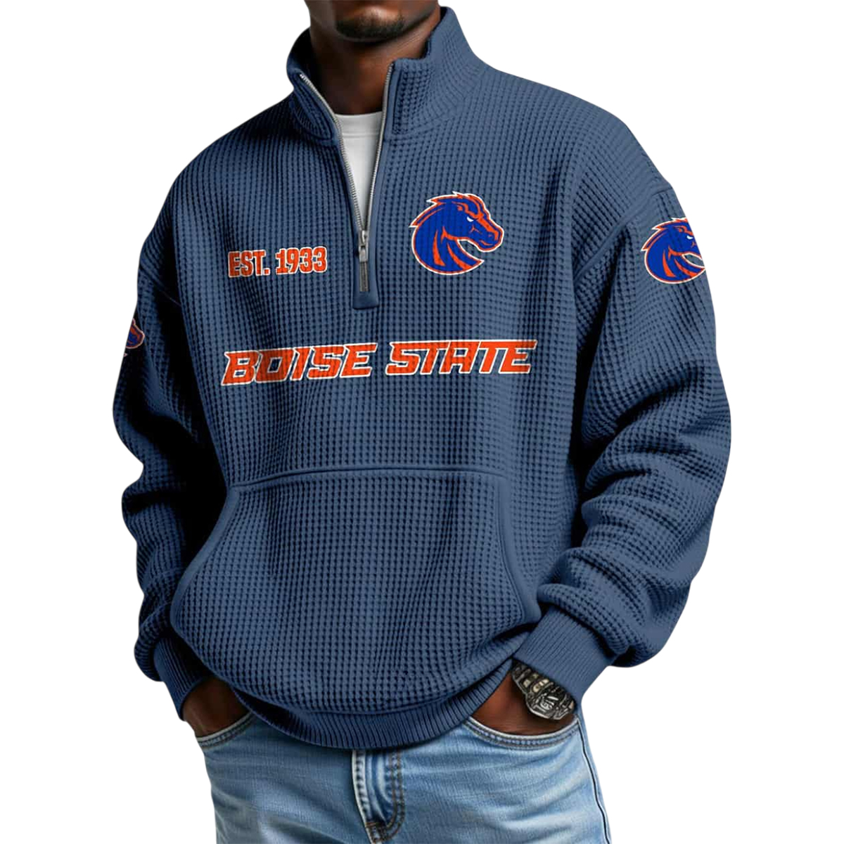 The Boise State Est 1933 Waffle Stand Collar Half Zip Sweatshirt is designed for those who appreciate heritage, identity, and a confident athletic look that never goes out of style.